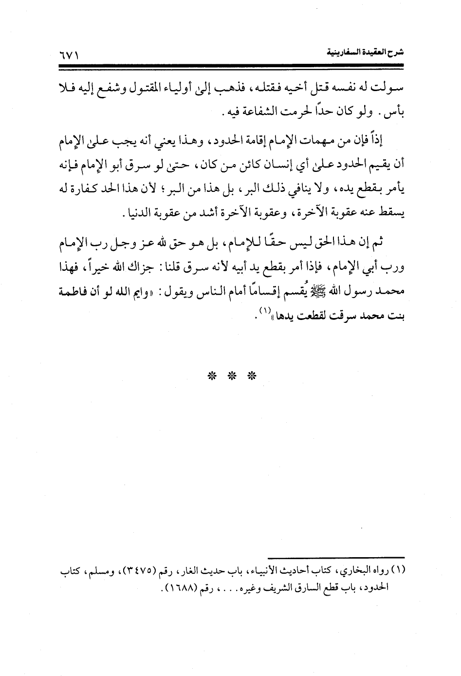 إذاً فإن من مهمات الإمام إقامة الحدود، وهذا يعني أنه يجب على الإمام أن يقيم الحدود على أي إنسان كائن من كان، حتى لو سرق أبو الإمام فإنه يأمر بقطع يده، ولا ينافي ذلك البر، بل هذا من البر؛ لأن هذا الحد كفارة له يسقط عنه عقوبة الآخرة، وعقوبة الآخرة أشد من عقوبة الدنيا.