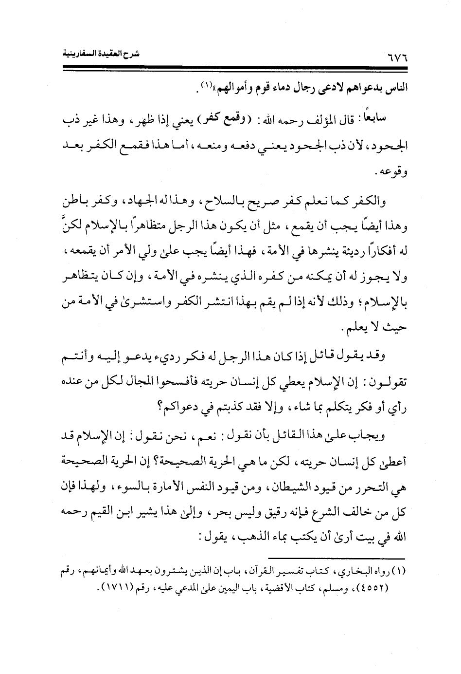 ويجاب على هذا القائل بأن نقول: نعم، نحن نقول: إن الإسلام قد أعطى كل إنسان حريته، لكن ما هي الحرية الصحيحة؟ إن الحرية الصحيحة هي التحرر من قيود الشيطان، ومن قيود النفس الأمارة بالسوء، ولهذا فإن كل من خالف الشرع فإنه رقيق وليس بحر، والى هذا يشير ابن القيم رحمه الله في بيت أرى أن يكتب بماء الذهب، يقول: