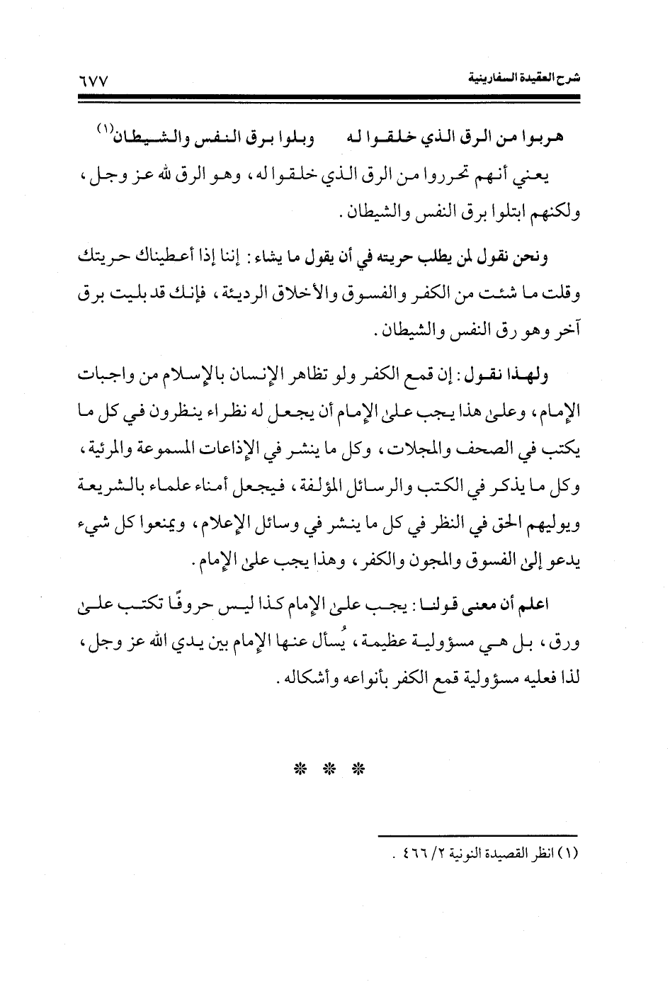 ونحن نقول لمن يطلب حريته في أن يقول ما يشاء: إننا إذا أعطيناك حريتك وقلت ما شئت من الكفر والفسوق والأخلاق الرديئة، فإنك قد بليت برق آخر وهو رق النفس والشيطان.