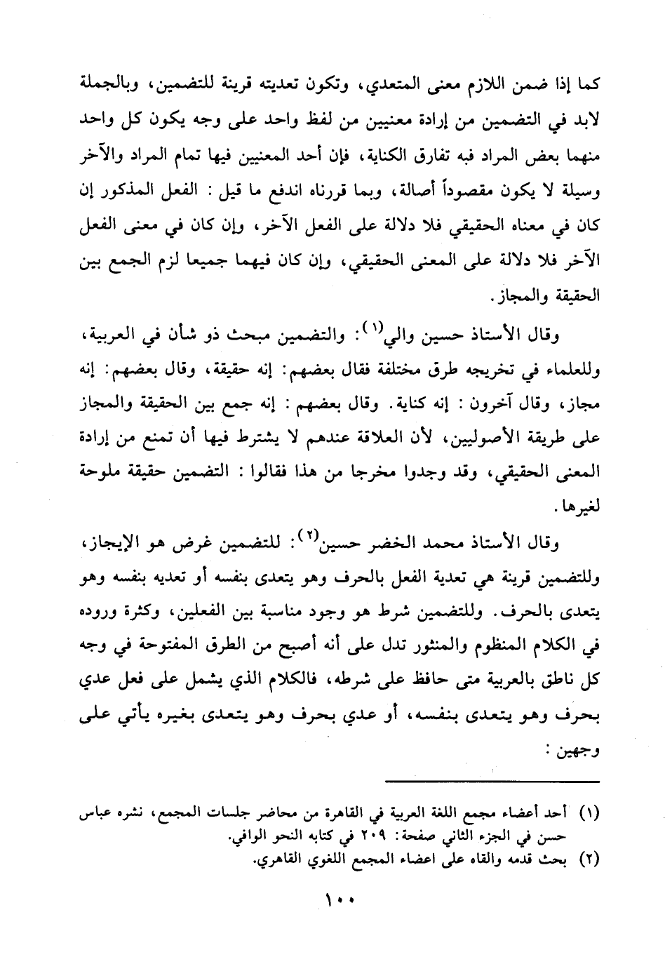 وقال الأستاذ محمد الخضر حسين: للتضمين غرض هو الإيجاز، وللتضمين قرينة هي تعدية الفعل بالحرف وهو يتعدى بنفسه أو تعديه بنفسه وهو يتعدى بالحرف. وللتضمين شرط هو وجود مناسبة بين الفعلين، وكثرة وروده في الكلام المنظوم والمنثور تدل على أنه أصبح من الطرق المفتوحة في وجه كل ناطق بالعربية متى حافظ على شرطه، فالكلام الذي يشمل على فعل عدي بحرف وهو يتعدى بنفسه، أو عدي بحرف وهو يتعدى بغيره يأتي على وجهين: