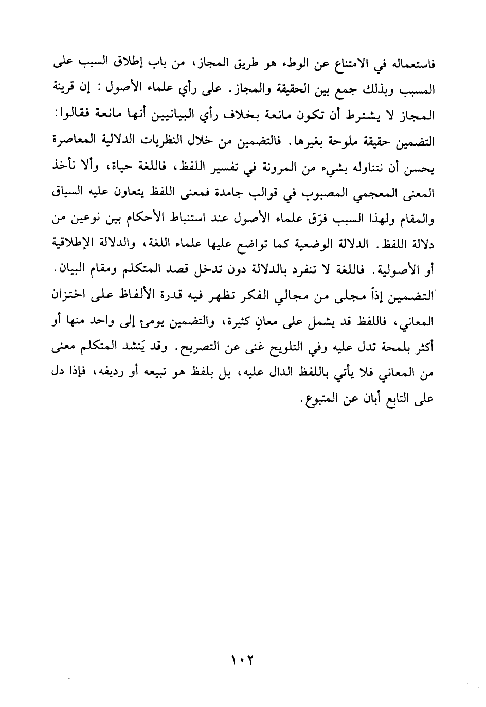 فاستعماله في الامتناع عن الوطء هو طريق المجاز، من باب إطلاق السبب على المسبب وبذلك جمع بين الحقيقة والمجاز. على رأي علماء الأصول: إن قرينة المجاز لا يشترط أن تكون مانعة بخلاف رأي البيانيين أنها مانعة فقالوا: التضمين حقيقة ملوحة بغيرها. فالتضمين من خلال النظريات الدلالية المعاصرة يحسن أن نتناوله بشيء من المرونة في تفسير اللفظ، فاللغة حياة، وألا نأخذ المعنى المعجمي المصبوب في قوالب جامدة فمعنى اللفظ يتعاون عليه السياق والمقام ولهذا السبب فرق علماء الأصول عند استنباط الأحكام بين نوعين من دلالة اللفظ. الدلالة الوضعية كما تواضع عليها علماء اللغة، والدلالة الإطلاقية أو الأصولية. فاللغة لا تنفرد بالدلالة دون تدخل قصد المتكلم ومقام البيان.