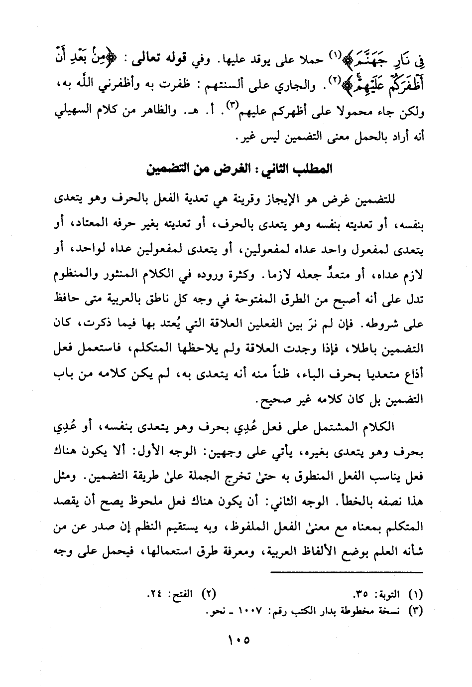 فِي نَارِ جَهَنَّمَ) حملا على يوقد عليها. وفي قوله تعالى: (مِنْ بَعْدِ أَنْ أَظْفَرَكُمْ عَلَيْهِمْ). والجاري على ألسنتهم: ظفرت به وأظفرني اللَّه به، ولكن جاء محمولا على أظهركم عليهم. أ. هـ. والظاهر من كلام السهيلي أنه أراد بالحمل معنى التضمين ليس غير.