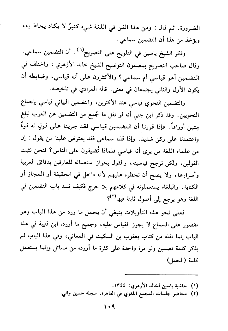 والتضمين النحوي قياسي عند الأكثرين، والتضمين البياني قياسي بإجماع النحويين. وقد ذكر ابن جني أنه لو نقل ما جُمع من التضمين عن العرب لبلغ مِئين أوراقاً. فإذا قررنا أن التضمين قياسي فقد جرينا على قول له قوةٌ واعتمدنا على ركن شديد. وإذا قلنا سماعي فقد يعترض علينا من يقول: إن من علماء اللغة من يرى أنه قياسي فلماذا تُضيقون على الناس؟ فنحن نثبت القولين، ولكن نرجح قياسيته، والقول بجواز استعماله للعارفين بدقائق العربية وأسرارها، ولا يصح أن نحظره عليهم لأنه داخل في الحقيقة أو المجاز أو الكناية. والبلغاء يستعملونه في كلامهم بلا حرج فكيف نسد باب التضمين في اللغة وهو يرجع إلى أصول ثابتة فيها؟ فعلى نحو - هذه التأويلات ينبغي أن يحمل ما ورد من هذا الباب وهو مقصور على السماع لا يجوز القياس عليه، وجميع ما أورده ابن قتيبة في هذا الباب إنما نقله من كتاب يعقوب بن السكيت في المعاني، وفي هذا الباب لم يذكر كلمة تضمين ولو مرة واحدة على كثرة ما أورده من مسائل وإنما يستعمل كلمة (الحمل)