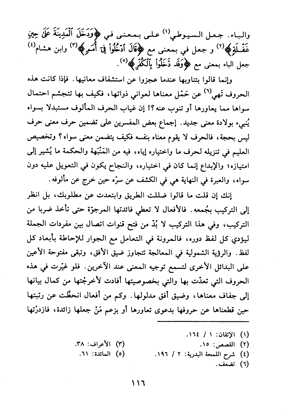 الحروف التي تعدت بها والتي بخصوصيتها أفادت لأخرجتها من كمال بيانها إلى جفاف معناها، وضيق أفق مدلولها. وكلم من أفعال انحطت عن رتبتها حين قطعناها عن حروفها بدعوى تعاورها أو بزعم مَنْ جعلها زائدة، فازدرتها