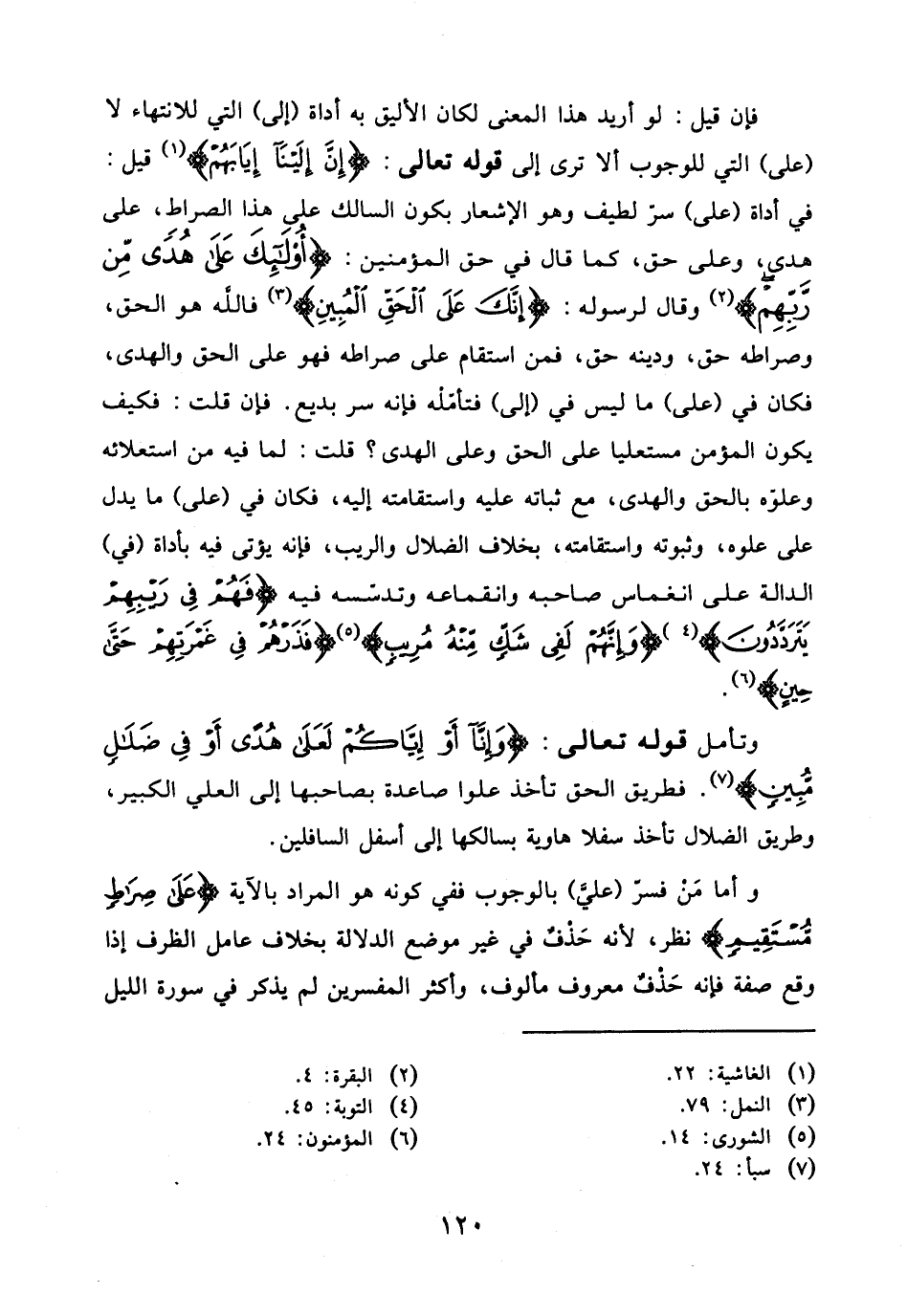 فإن قيل: لو أريد هذا المعنى لكان الأليق به أداة (إلى) التي للانتهاء لا (على) التي للوجوب ألا ترى إلى قوله تعالى: (إِنَّ إِلَيْنَا إِيَابَهُمْ) قيل: في أداة (على) سر لطيف وهو الإشعار بكون السالك على هذا الصراط، على هدى، وعلى حق، كما قال في حق المؤمنين: (أُولَئِكَ عَلَى هُدًى مِنْ رَبِّهِمْ) وقال لرسوله: (إِنَّكَ عَلَى الْحَقِّ الْمُبِينِ) فاللَّه هو الحق، وصراطه حق، ودينه حق، فمن استقام على صراطه فهو على الحق والهدى، فكان في (على) ما ليس في (إلى) فتأمله فإنه سر بديع. فإن قلت: فكيف يكون المؤمن مستعليا على الحق وعلى الهدى؟ قلت: لما فيه من استعلائه وعلوه بالحق والهدى، مع ثباته عليه واستقامته إليه، فكان في (على) ما يدل على علوه، وثبوته واسقامته، بخلاف الضلال والريب، فإنه يؤتى فيه بأداة (في) الدالة على انغماس صاحبه وانقماعه وتدشسه فيه (فَهُمْ فِي رَيْبِهِمْ يَتَرَدَّدُونَ) (وَإِنَّهُمْ لَفِي شَكٍّ مِنْهُ مُرِيبٍ) (فَذَرْهُمْ فِي غَمْرَتِهِمْ حَتَّى حِينٍ).