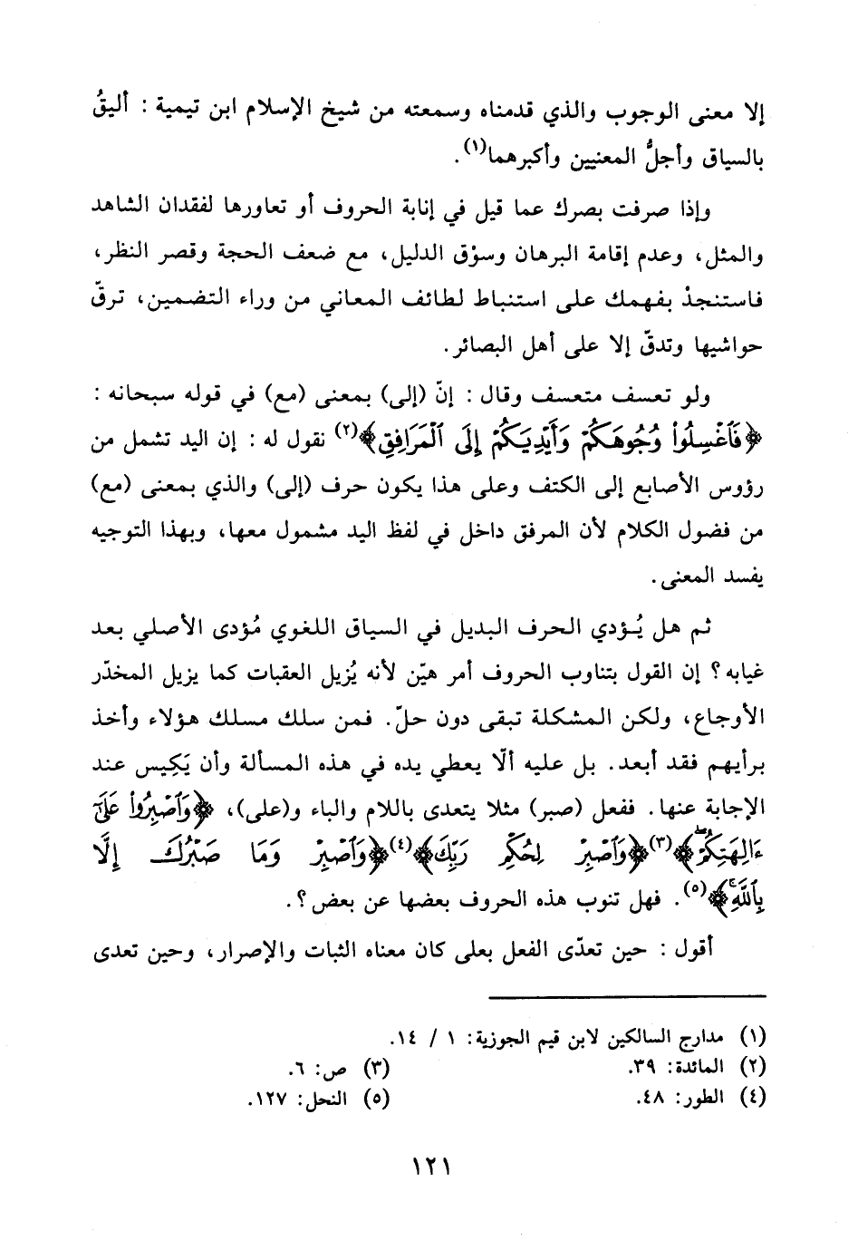 الإجابة عنها. ففعل (صبر) مثلا يتعدى باللام والباء و (على)، (وَاصْبِرُوا عَلَى آلِهَتِكُمْ) (وَاصْبِرْ لِحُكْمِ رَبِّكَ) (وَاصْبِرْ وَمَا صَبْرُكَ إِلَّا بِاللَّهِ). فهل تنوب هذه الحروف بعضها عن بعض؟.