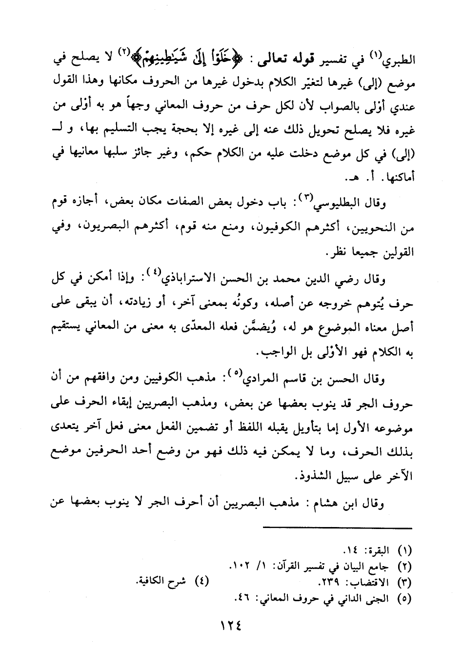 الطبري في تفسير قوله تعالى: (خَلَوْا إِلَى شَيَاطِينِهِمْ) لا يصلح في موضع (إلى) غيرها لتغير الكلام بدخول غيرها من الحروف مكانها وهذا القول عندي أوْلى بالصواب لأن لكل حرف من حروف المعاني وجها هو به أوْلى من غيره فلا يصلح تحويل ذلك عنه إلى غيره إلا بحجة يجب التسليم بها، ولـ (إلى) في كل موضع دخلت عليه من الكلام حكم، وغير جائز سلبها معانيها في أماكنها. أ. هـ.