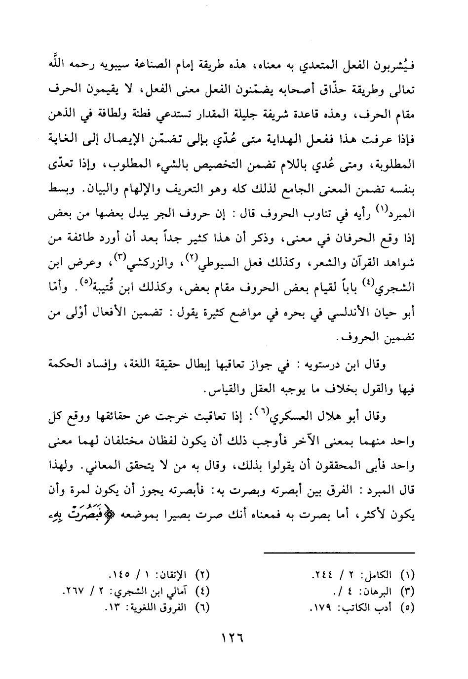 وقال أبو هلال العسكري: إذا تعاقبت خرجت عن حقائقها ووقع كل واحد منهما بمعنى الآخر فأوجب ذلك أن يكون لفظان مختلفان لهما معنى واحد فأبى المحققون أن يقولوا بذلك، وقال به من لا يتحقق المعاني. ولهذا قال المبرد: الفرق بين أبصرته وبصرت به: فأبصرته يجوز أن يكون لمرة وأن يكون لأكثر، أما بصرت به فمعناه أنك صرت بصيرا بموضعه (فَبَصُرَتْ بِهِ