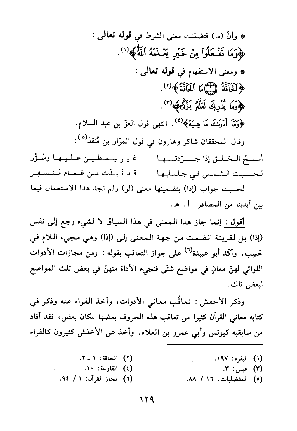 أقول: إنما جاز هذا المعنى في هذا السياق لا لشيء رجع إلى نفس (إذا) بل لقرينة انضمت من جهة المعنى إلى (إذا) وهي مجيء اللام في حَسِب، وأكد أبو عبيدة على جواز التعاقب بقوله: ومن مجازات الأدوات اللواتي لهن معانٍ في مواضع شتى فتجيء الأداة منهن في بعض تلك المواضع لبعض تلك.