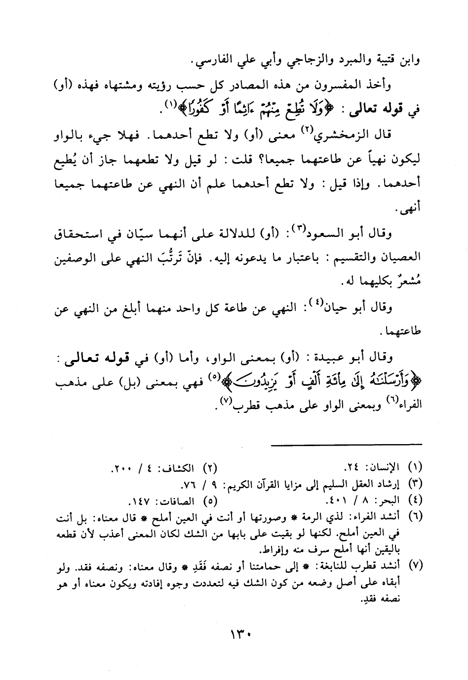 وأخذ المفسرون من هذه المصادر كل حسب رؤيته ومشتهاه فهذه (أو) في قوله تعالى: (وَلَا تُطِعْ مِنْهُمْ آثِمًا أَوْ كَفُورًا).
