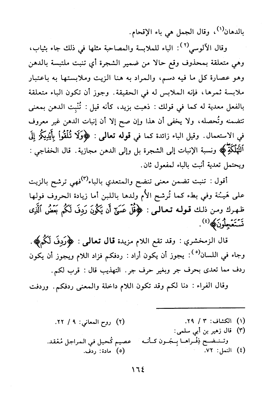 أقول: تنبت تضمن معنى تنضح والمتعدي بالباء فهي ترشح بالزيت على هَيْنة وفي بطء كما تُرشح الأم ولدها باللبن أما زيادة الحروف فولها ظهرك ومن ذلك قوله تعالى: (قُلْ عَسَى أَنْ يَكُونَ رَدِفَ لَكُمْ بَعْضُ الَّذِي تَسْتَعْجِلُونَ).