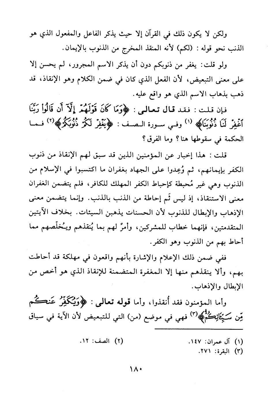 ولو قلت: يغفر من ذنوبكم دون أن يذكر الاسم المجرور، لم يحسن إلا على معنى التبعيض، لأن الفعل الذي كان في ضمن الكلام وهو الإنقاذ، قد ذهب بذهاب الاسم الذي هو واقع عليه.