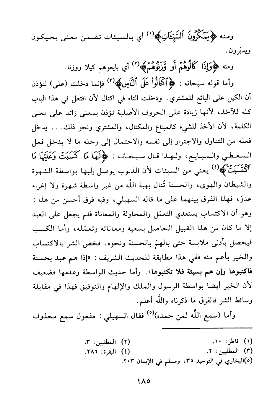 وأما قوله سبحانه: (اكْتَالُوا عَلَى النَّاسِ) فإنما دخلت (على) لتؤذن أن الكيل على البائع للمشتري. ودخلت التاء في اكتال لأن افتعل في هذا الباب كله للآخذ، لأنها زيادة على الحروف الأصلية تؤذن بمعنى زائد على معنى الكلمة، لأن الآخذ للشيء كالمبتاع والمكتال، والمشتري ونحو ذلك ... يدخل فعله من التناول والاجترار إلى نفسه والاحتمال إلى رحله ما لا يدخل فعل المعطي والمبايع، ولهذا قال سبحانه: (الَهَا مَا كَسَبَتْ وَعَلَيْهَا مَا اكْتَسَبَتْ) يعني من السيئات لأن الذنوب يوصل إليها بواسطة الشهوة والشيطان والهوى، والحسنة تُنال بهبة اللَّه من غير واسطة شهوة ولا إغراء عدو، فهذا الفرق بينهما على ما قاله السهيلي، وفيه فرق أحسن من هذا: وهو أن الاكتساب يستعدي التعمّل والمحاولة والمعاناة فلم يجعل على العبد إلا ما كان من هذا القبيل الحاصل بسعيه ومعاناته وتعمّله، وأما الكسب فيحصل بأدنى ملابسة حتى بالهم بالحسنة ونحوه. فخص الشر بالاكتساب والخير بأعم منه ففي هذا مطابقة للحديث الشريف: " إذا همَّ عبد بحسنة فاكتبوها وإن هم بسيئة فلا تكتبوها ". وأما حديث الواسطة وعدمها فضعيف لأن الخير أيضا بواسطة الرسول والملك والإلهام والتوفيق فهذا في مقابلة وسائط الشر فالفرق ما ذكرناه واللَّه أعلم.