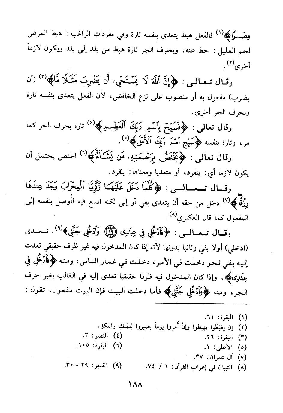 وقَالَ تَعَالَى: (إِنَّ اللَّهَ لَا يَسْتَحْيِي أَنْ يَضْرِبَ مَثَلًا مَا) (أن يضرب) مفعول به أو منصوب على نزع الخافض، لأن الفعل يتعدى بنفسه تارة وبحرف الجر أخرى.