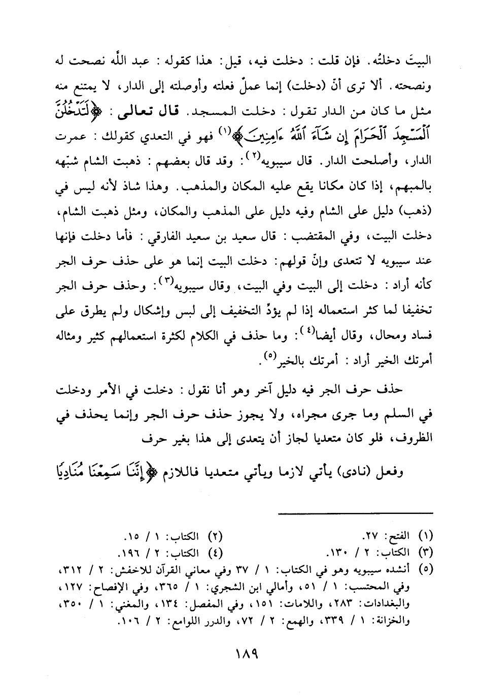 البيتَ دخلتُه. فإن قلت: دخلت فيه، قيل: هذا كقوله: عبد اللَّه نصحت له ونصحته. ألا ترى أن (دخلت) إنما عمل فعلته وأوصلته إلى الدار، لا يمتنع منه مثل ما كان من الدار تقول؛ دخلت المسجد. قَالَ تَعَالَى: (لَتَدْخُلُنَّ الْمَسْجِدَ الْحَرَامَ إِنْ شَاءَ اللَّهُ آمِنِينَ) فهو في التعدي كقولك: عمرت الدار، وأصلحت الدار. قال سيبويه: وقد قال بعضهم: ذهبت الشام شبهه بالمبهم، إذا كان مكانا يقع عليه المكان والمذهب. وهذا شاذ لأنه ليس في (ذهب) دليل على الشام وفيه دليل على المذهب والمكان، ومثل ذهبت الشام، دخلت البيت، وفي المقتضب: قال سعيد بن سعيد الفارقي؛ فأما دخلت فإنها عند سيبويه لا تتعدى وإن قولهم: دخلت البيت إنما هو على حذف حرف الجر