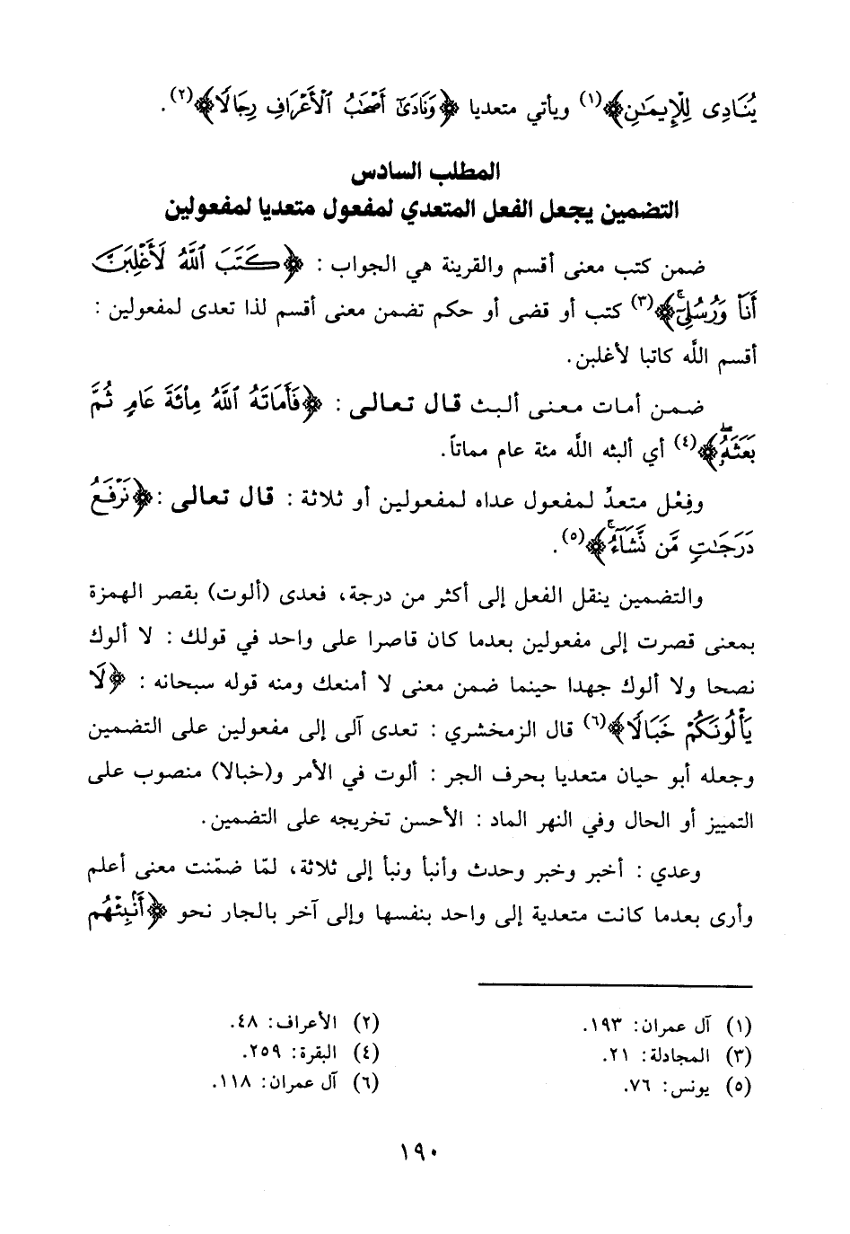 والتضمين ينقل الفعل إلى أكثر من درجة، فعدى (ألوت) بقصر الهمزة بمعنى قصرت إلى مفعولين بعدما كان قاصرا على واحد في قولك: لا ألوك نصحا ولا ألوك جهدا حينما ضمن معنى لا أمنعك ومنه قوله سبحانه: (لَا يَأْلُونَكُمْ خَبَالًا) قال الزمخشري: تعدى آلى إلى مفعولين على التضمين وجعله أبو حيان متعديا بحرف الجر: ألوت في الأمر و (خبالا) منصوب على التمييز أو الحال وفي النهر الماد: الأحسن تخريجه على التضمين.
