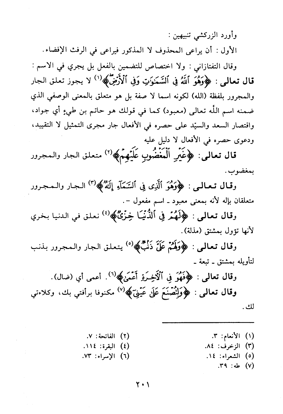 وقال التفتازاني: ولا اختصاص للتضمين بالفعل بل يجري في الاسم: قَال تعالى: (وَهُوَ اللَّهُ فِي السَّمَاوَاتِ وَفِي الْأَرْضِ) لا يجوز تعلق الجار والمجرور بلفظة (الله) لكونه اسما لا صفة بل هو متعلق بالمعنى الوصفي الذي ضمنه اسم اللَّه تعالى (معبود) كما في قولك هو حاتم بن طيء أي جياد، واقتصار السعد والسيد على حصره في الأفعال جار مجرى التمثيل لا التقييد، ودعوى حصره في الأفعال لا دليل عليه قَالَ تَعَالَى: (غَيْرِ الْمَغْضُوبِ عَلَيْهِمْ) متعلق الجار والمجرور بمغضوب.