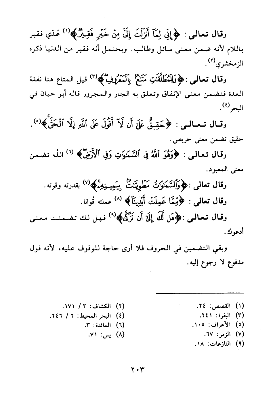 وبقي التضمين في الحروف فلا أرى حاجة للوقوف عليه، لأنه قول مدفوع لا رجوع إليه.