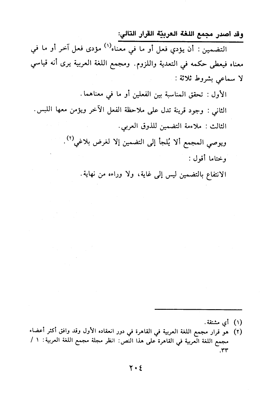 ويوصي المجمع ألا يُلجأ إلى التضمين إلا لغرض بلاغي.