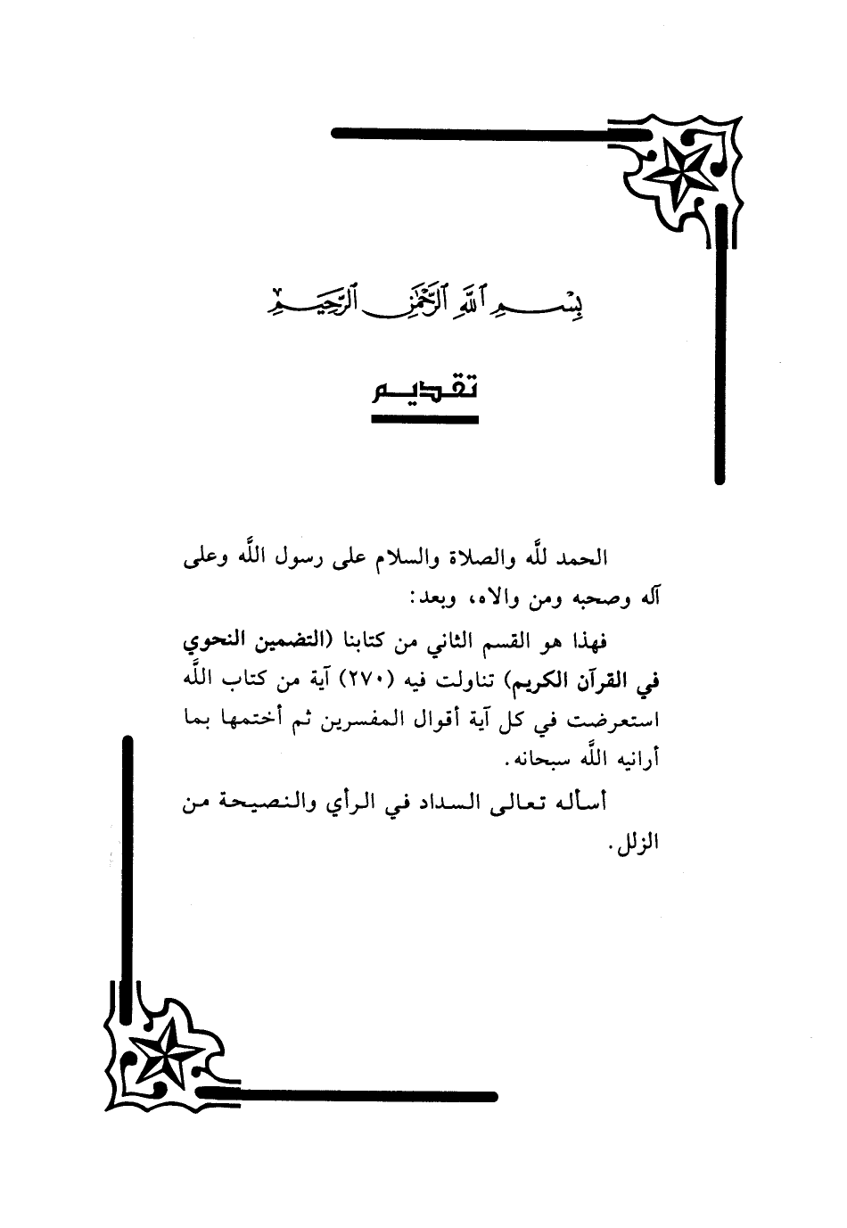فهذا هو القسم الثاني من كتابنا (التضمين النحوي في القرآن الكريم) تناولت فيه (270) آية من كتاب اللَّه استعرضت في كل آية أقوال المفسرين ثم أختمها بما أرانيه اللَّه سبحانه.