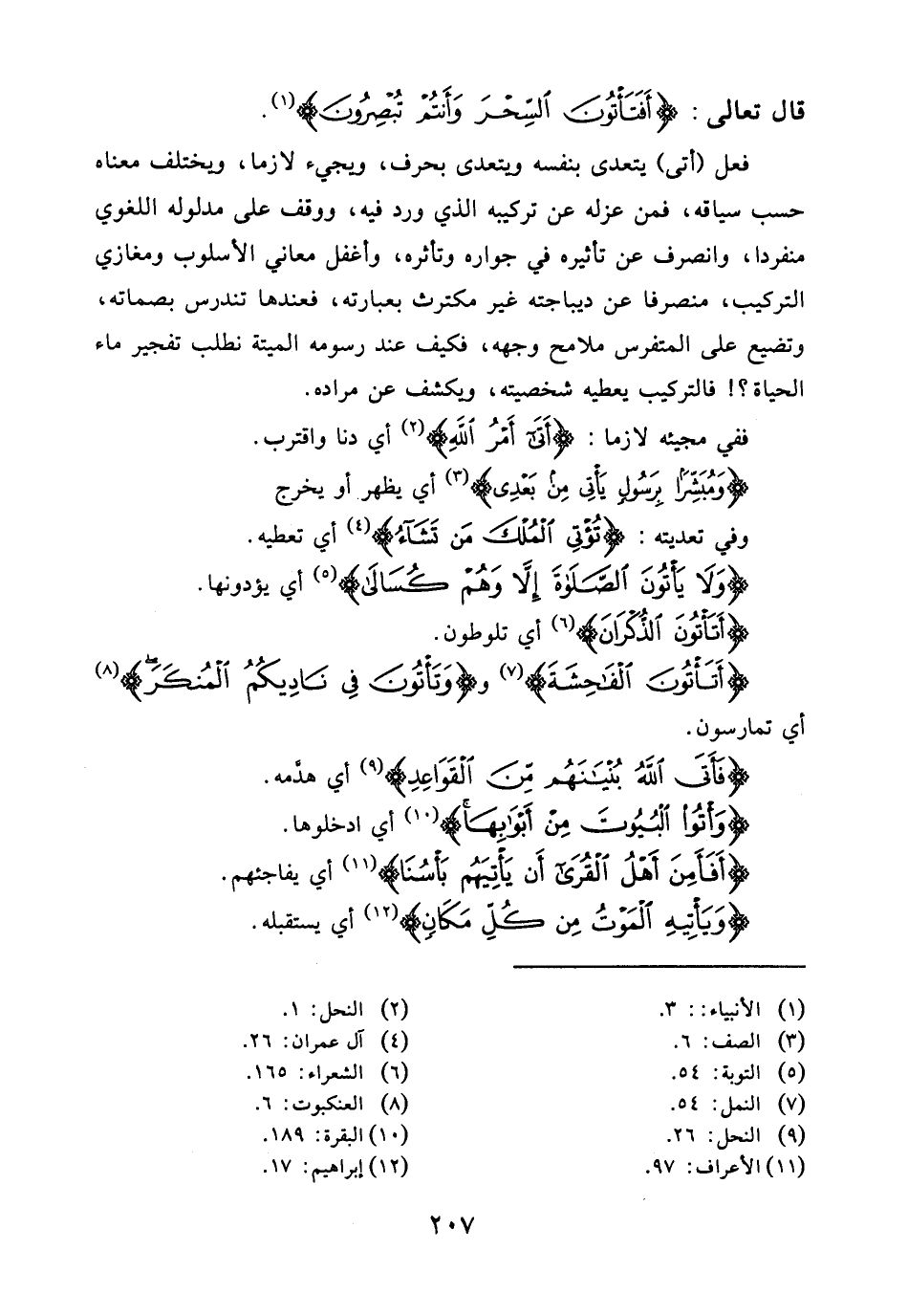 فعل (أتى) يتعدى بنفسه ويتعدى بحرف، ويجيء لازما، ويختلف معناه حسب سياقه، فمن عزله عن تركيبه الذي ورد فيه، ووقف على مدلوله اللغوي منفردا، وانصرف عن تأثيره في جواره وتأثره، وأغفل معاني الأسلوب ومغازي التركيب، منصرفا عن ديباجته غير مكترث بعبارته، فعندها تندرس بصماته، وتضيع على المتفرس ملامح وجهه، فكيف عند رسومه الميتة نطلب تفجير ماء الحياة؟! فالتركيب يعطيه شخصيته، ويكشف عن مراده.