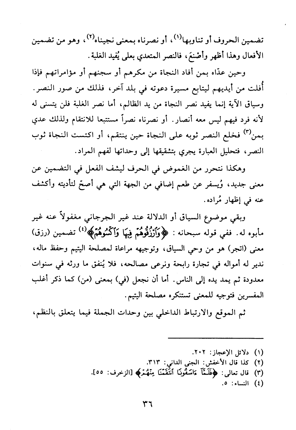 وهكذا نتحرر من الغموض في الحرف ليشف الفعل في التضمين عن معنى جديد، ويُسفر عن طعم إضافي من الجهة التي هي أصحّ لتأديته وأكشف عنه في إظهار مُراده.