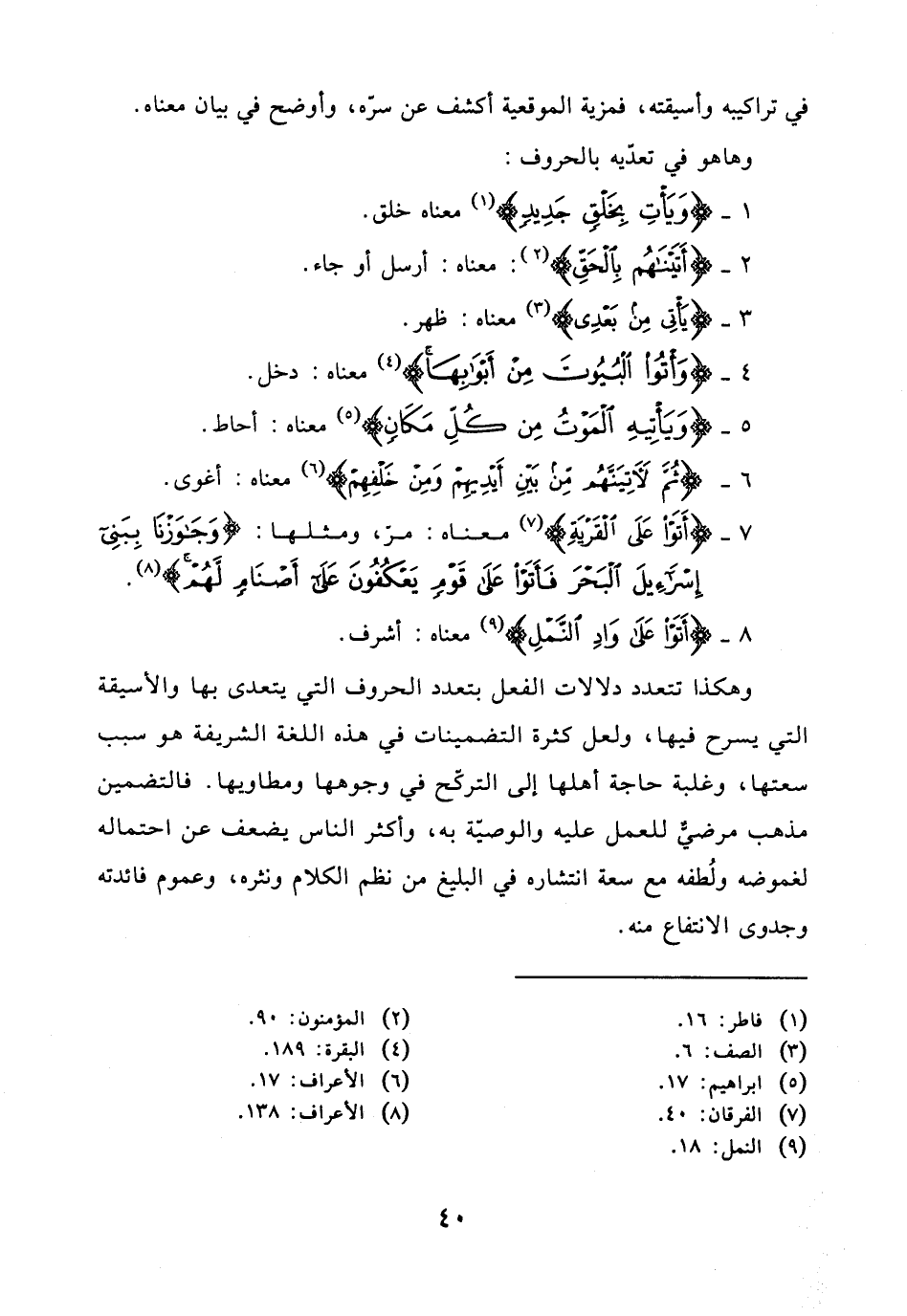 وهكذا تتعدد دلالات الفعل بتعدد الحروف التي يتعدى بها والأسيقة التي يسرح فيها، ولعل كثرة التضمينات في هذه اللغة الشريفة هو سبب سعتها، وغلبة حاجة أهلها إلى التركح في وجوهها ومطاويها. فالتضمين مذهب مرضي للعمل عليه والوصية به، وأكثر الناس يضعف عن احتماله لغموضه ولُطفه مع سعة انتشاره في البليغ من نظم الكلام ونثره، وعموم فائدته وجدوى الانتفاع منه.