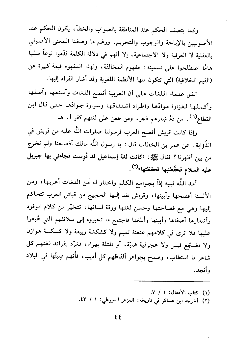 اتفق علماء اللغات على أن العربية أنصع اللغات وأسنعها وآصلها وأكملها لغزارة موادها واطراد اشتقاقها وسرارة جوادّها حتى قال ابن القطاع: من ذمَّ شِعرهم فجر، ومن طعن على لغتهم كفر أ. هـ وإذا كانت قريش أفصح العرب فرسولنا صلوات اللَّه عليه من قريش في الذُؤابة. عن عمر بن الخطاب قال: يا رسول اللَّه مالك أفصحنا ولم تخرج من بين أظهرنا؟ فقال - صَلَّى اللَّهُ عَلَيهِ وَسَلَّمَ -: " كانت لغة إسماعيل قد دُرِست فجاءني بها جبريل عليه السلام فحفظنيها فحفظتها).