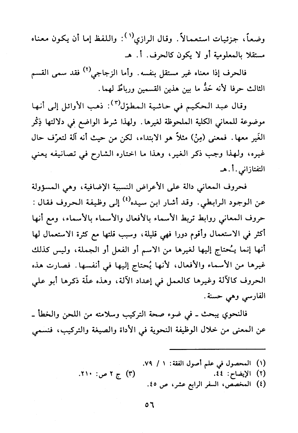 وقال عبد الحكيم في حاشية المطول: ذهب الأوائل إلى أنها موضوعة للمعاني الكلية الملحوظة لغيرها. ولهذا شرط الواضع في دلالتها ذِكْر الغَير معها. فمعنى (مِنْ) مثلاً هو الابتداء، لكن من حيث أنه آلة لتعرف حال غيره، ولهذا وجب ذكر الغير، وهذا ما اختاره الشارح في تصانيفه يعني التفتازاني. أ. هـ فحروف المعاني دالة على الأعراض النسبية الإضافية، وهي المسؤولة عن الوجود الرابطي. وقد أشار ابن سيده إلى وظيفة الحروف فقال: حروف المعاني روابط تربط الأسماء بالأفعال والأسماء بالأسماء، ومع أنها أكثر في الاستعمال وأقوم دورا فهي قليلة، وسبب قلتها مع كثرة الاستعمال لها أنها إنما يُحتاج إليها لغيرها من الاسم أو الفعل أو الجملة، وليس كذلك غيرها من الأسماء والأفعال، لأنها يُحتاج إليها في أنفسهاء فصارت هذه الحروف كالآلة وغيرها كالعمل في إعداد الآلة، وهذه علة ذكرها أبو علي الفارسي وهي حسنة.