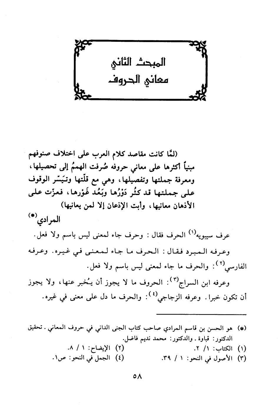 وعرفه المبرد فقال: الحرف ما جاء لمعنى في غيره. وعرفه الفارسي: والحرف ما جاء لمعنى ليس باسم ولا فعل.