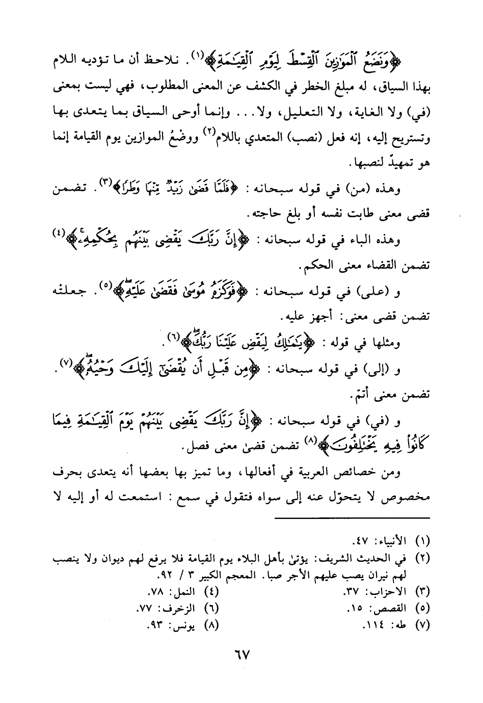 بهذا السياق، له مبلغ الخطر في الكشف عن المعنى المطلوب، فهي ليست بمعنى (في) ولا الغاية، ولا التعليل، ولا ... وإنَّمَا أوحى السياق بما يتعدى بها وتستريح إليه، إنه فعل (نصب) المتعدي باللام ووضعُ الموازين يوم القيامة إنما هو تمهيد لنصبها.