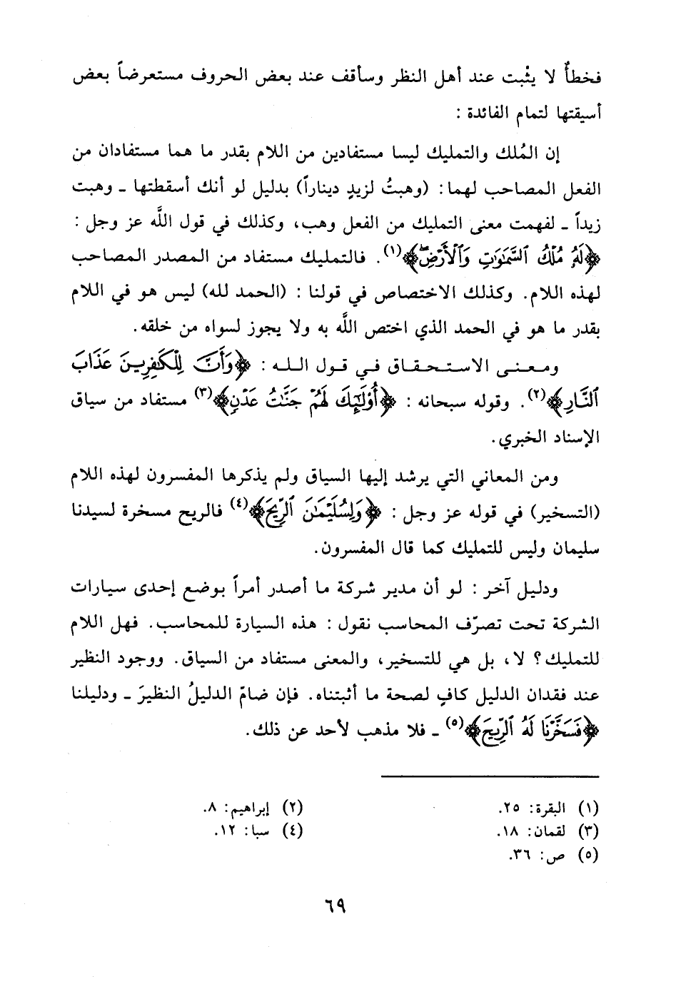 إن المُلك والتمليك ليسا مستفادين من اللام بقدر ما هما مستفادان من الفعل المصاحب لهما: (وهبتُ لزيدِ ديناراً) بدليل لو أنك أسقطتها - وهبت زيداً - لفهمت معنى التمليك من الفعل وهب، وكذلك في قول اللَّه عز وجل: (لَهُ مُلْكُ السَّمَاوَاتِ وَالْأَرْضِ). فالتمليك مستفاد من المصدر المصاحب لهذه اللام. وكذلك الاختصاص في قولنا: (الحمد لله) ليس هو في اللام بقدر ما هو في الحمد الذي اختص اللَّه به ولا يجوز لسواه من خلقه.