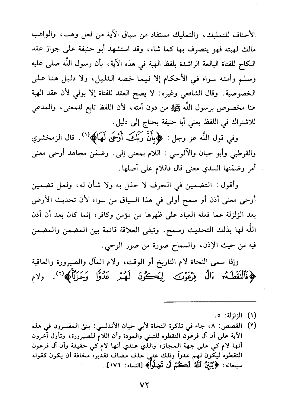 وفي قول اللَّه عز وجل: (بِأَنَّ رَبَّكَ أَوْحَى لَهَا). قال الزمخشري والقرطبي وأبو حيان والآلوسي: اللام بمعنى إلى. وضمن مجاهد أوحى معنى أمر وضمنها السدي معنى قال فاللام على أصلها.