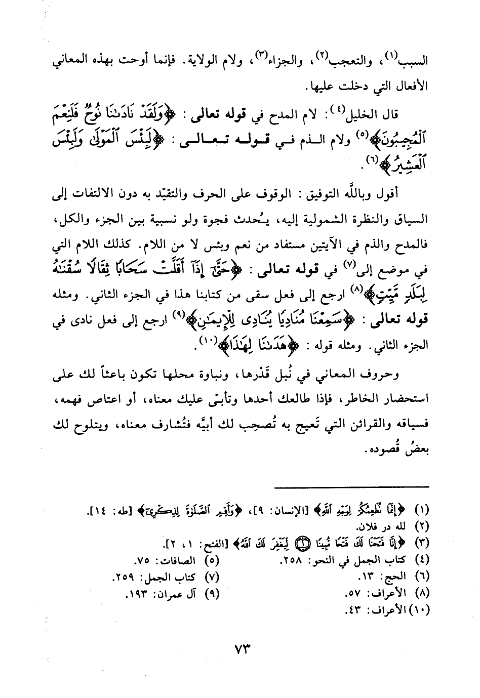 أقول وباللَّه التوفيق: الوقوف على الحرف والتقيد به دون الالتفات إلى السياق والنظرة الشمولية إليه، يُحدث فجوة ولو نسبية بين الجزء والكل، فالمدح والذم في الآيتين مستفاد من نعم وبئس لا من اللام. كذلك اللام التي في موضع إلى في قوله تعالى: (حَتَّى إِذَا أَقَلَّتْ سَحَابًا ثِقَالًا سُقْنَاهُ لِبَلَدٍ مَيِّتٍ) ارجع إلى فعل سقى من كتابنا هذا في الجزء الثاني. ومثله قوله تعالى: (سَمِعْنَا مُنَادِيًا يُنَادِي لِلْإِيمَانِ) ارجع إلى فعل نادى في الجزء الثاني. ومثله قوله: (هَدَانَا لِهَذَا).