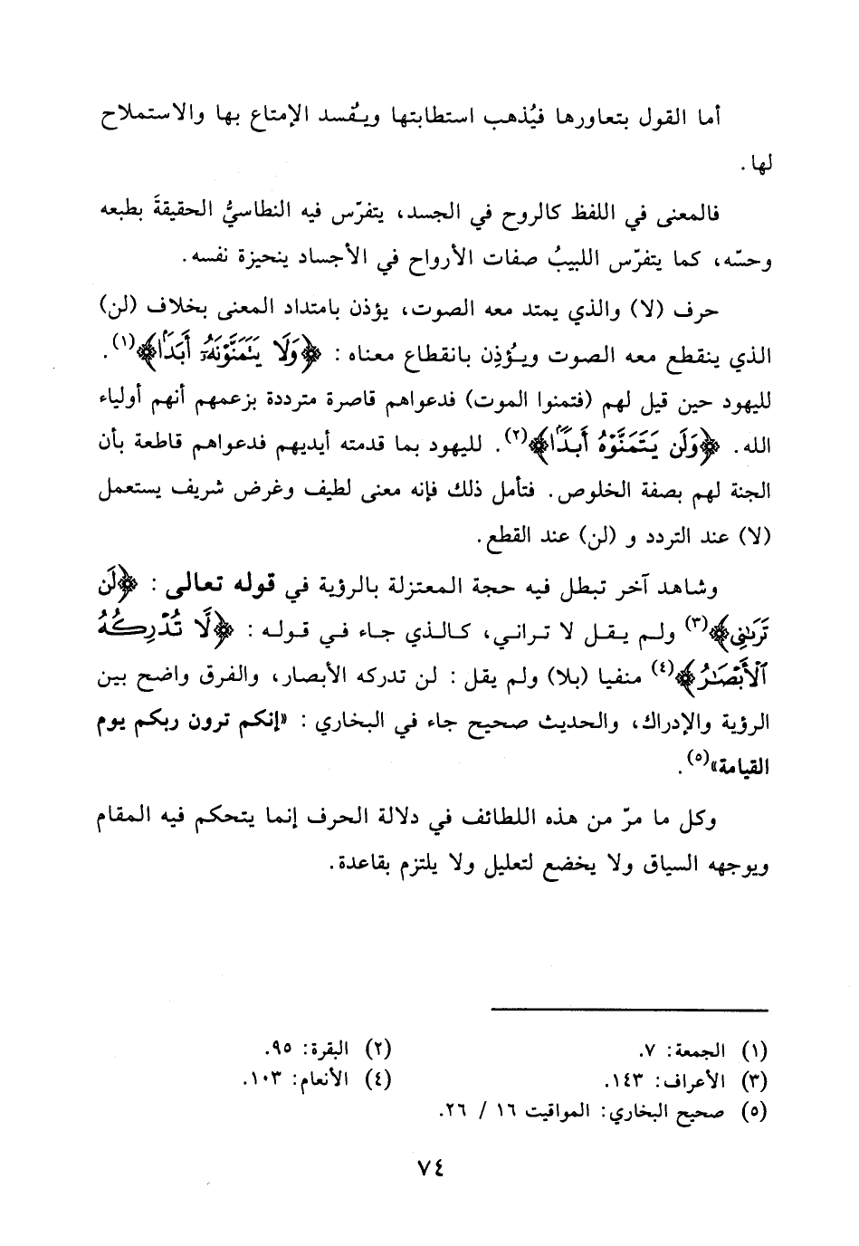 وشاهد آخر تبطل فيه حجة المعتزلة بالرؤية في قوله تعالى: (لَن تَرَاني) ولم يقل لا تراني، كالذي جاء في قوله: (لَا تُدْرِكُهُ الْأَبْصَارُ) منفيا بـ (لا) ولم يقل: لن تدركه الأبصار، والفرق واضح بين الرؤية والإدراك، والحديث صحيح جاء في البخاري: " إنكم ترون ربكم يوم القيامة ".