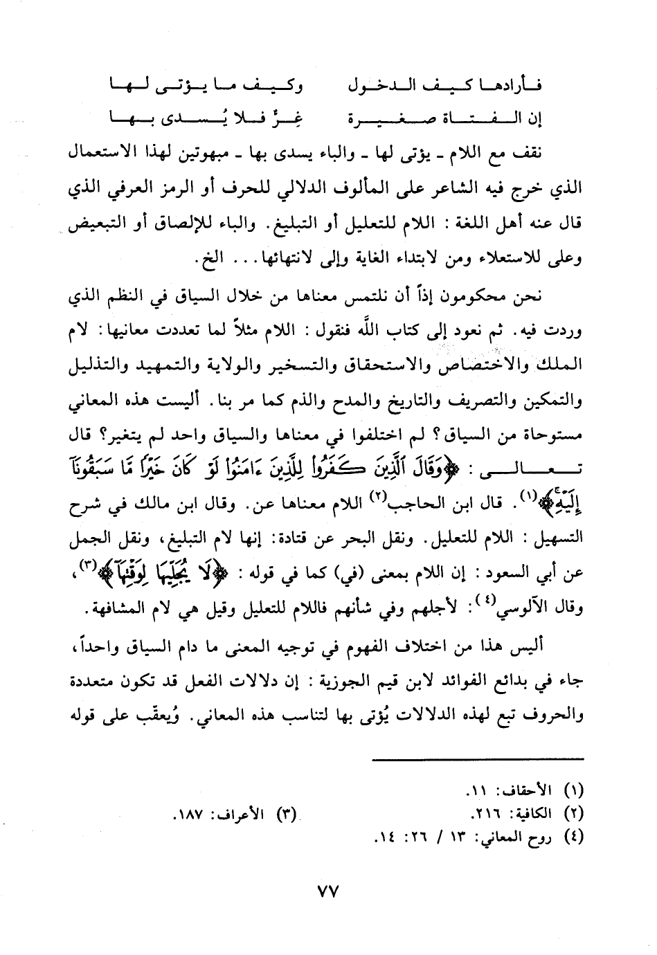 نحن محكومون إذاً أن نلتمس معناها من خلال السياق في النظم الذي وردت فيه. ثم نعود إلى كتاب اللَّه فنقول: اللام مثلاً لما تعددت معانيها: لام الملك والاختصاص والاستحقاق والتسخير والولاية والتمهيد والتذليل والتمكين والتصريف والتاريخ والمدح والذم كما مر بنا. أليست هذه المعاني مستوحاة من السياق؟ لم اختلفوا في معناها والسياق واحد لم يتغير؟ قال تعالى: (وَقَالَ الَّذِينَ كَفَرُوا لِلَّذِينَ آمَنُوا لَوْ كَانَ خَيْرًا مَا سَبَقُونَا إِلَيْهِ). قال ابن الحاجب اللام معناها عن. وقال ابن مالك في شرح التسهيل: اللام للتعليل. ونقل البحر عن قتادة: إنها لام التبليغ، ونقل الجمل عن أبي السعود: إن اللام بمعنى (في) كما في قوله: (لَا يُجَلِّيهَا لِوَقْتِهَا)، وقال الآلوسي: لأجلهم وفي شأنهم فاللام للتعليل وقيل هي لام المشافهة.