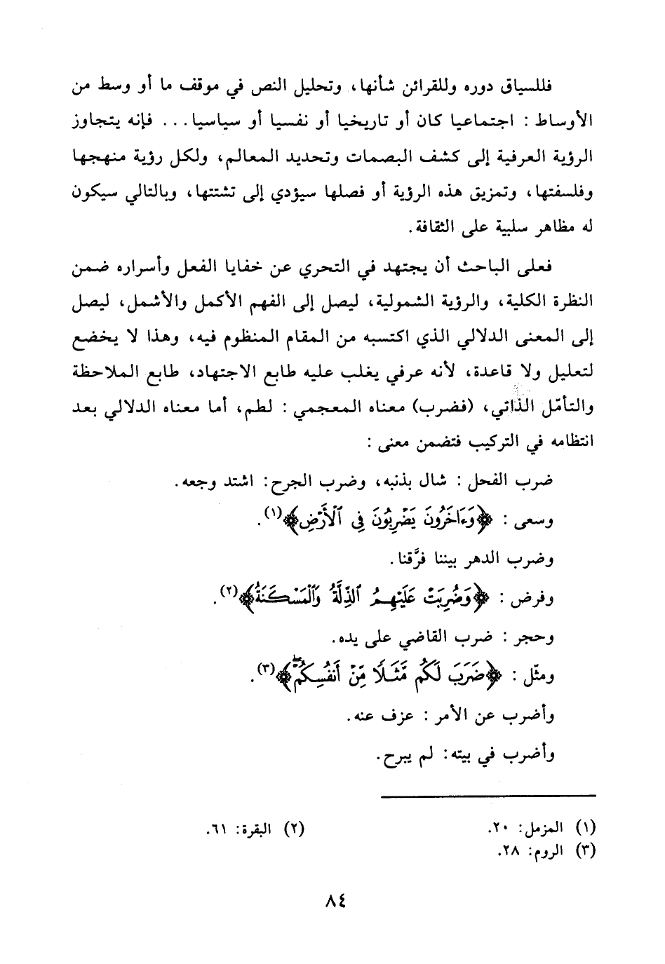 فعلى الباحث أن يجتهد في التحري عن خفايا الفعل وأسراره ضمن النظرة الكلية، والرؤية الشمولية، ليصل إلى الفهم الأكمل والأشمل، ليصل إلى المعنى الدلالي الذي اكتسبه من المقام المنظوم فيه، وهذا لا يخضع لتعليل ولا قاعدة، لأنه عرفي يغلب عليه طابع الاجتهاد، طابع الملاحظة والتأمل الذاتي، (فضرب) معناه المعجمي: لطم، أما معناه الدلالي بعد انتظامه في التركيب فتضمن معنى: