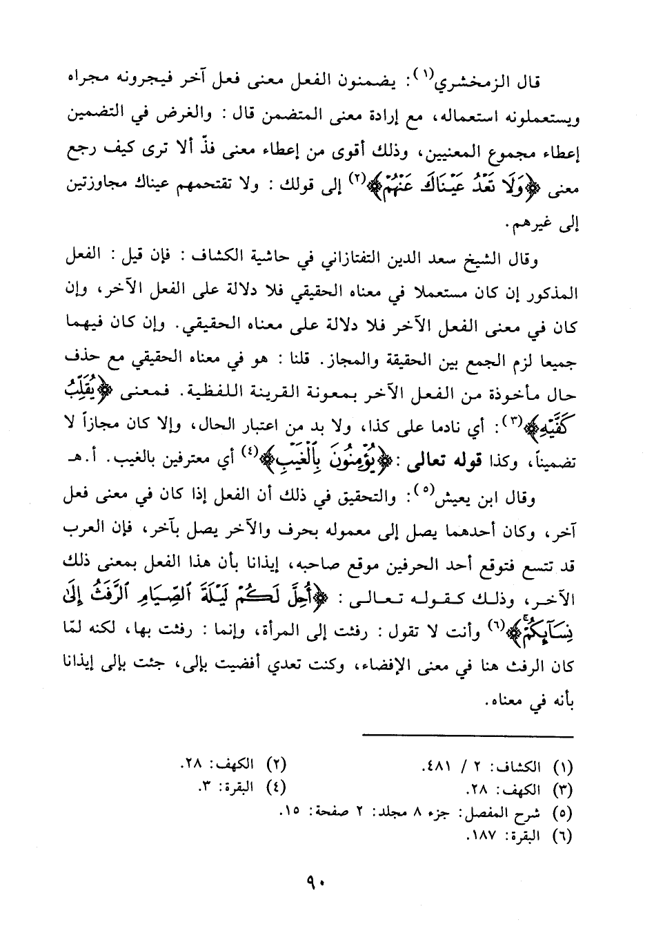 وقال الشيخ سعد الدين التفتازاني في حاشية الكشاف: فإن قيل: الفعل المذكور إن كان مستعملا في معناه الحقيقي فلا دلالة على الفعل الآخر، وإن كان في معنى الفعل الآخر فلا دلالة على معناه الحقيقي. وإن كان فيهما جميعا لزم الجمع بين الحقيقة والمجاز. قلنا: هو في معناه الحقيقي مع حذف حال مأخوذة من الفعل الآخر بمعونة القرينة اللفظية. فمعنى (يُقَلِّبُ كَفَّيْهِ): أي نادما على كذا، ولا بد من اعتبار الحال، وإلا كان مجازاً لا تضميناً، وكذا قوله تعالى: (يُؤْمِنُونَ بِالْغَيْبِ) أي معترفين بالغيب. أ. هـ وقال ابن يعيش: والتحقيق في ذلك أن الفعل إذا كان في معنى فعل آخر، وكان أحدهما يصل إلى معموله بحرف والآخر يصل بآخر، فإن العرب قد تتسع فتوقع أحد الحرفين موقع صاحبه، إيذانا بأن هذا الفعل بمعنى ذلك الآخر، وذلك كقوله تعالى: (أُحِلَّ لَكُمْ لَيْلَةَ الصِّيَامِ الرَّفَثُ إِلَى نِسَائِكُمْ) وأنت لا تقول: رفثت إلى المرأة، وإنما: رفثت بها، لكنه لما كان الرفث هنا في معنى الإفضاء، وكنت تعدي أفضيت بـ (إلى)، جئت بـ (إلى) إيذانا بأنه في معناه.