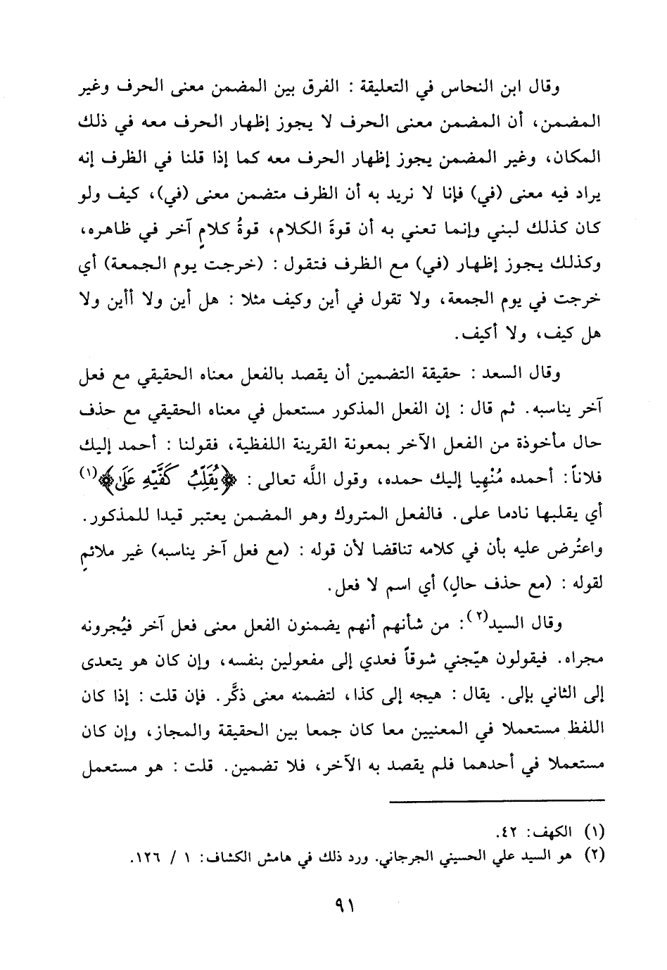 وقال السعد: حقيقة التضمين أن يقصد بالفعل معناه الحقيقي مع فعل آخر يناسبه. ثم قال: إن الفعل المذكور مستعمل في معناه الحقيقي مع حذف حال مأخوذة من الفعل الآخر بمعونة القرينة اللفظية، فقولنا: أحمد إليك فلاناً: أحمده مُنْهِيا إليك حمده، وقول اللَّه تعالى: (يُقَلِّبُ كَفَّيْهِ عَلَى) أي يقلبها نادما على. فالفعل المتروك وهو المضمن يعتبر قيدا للمذكور.