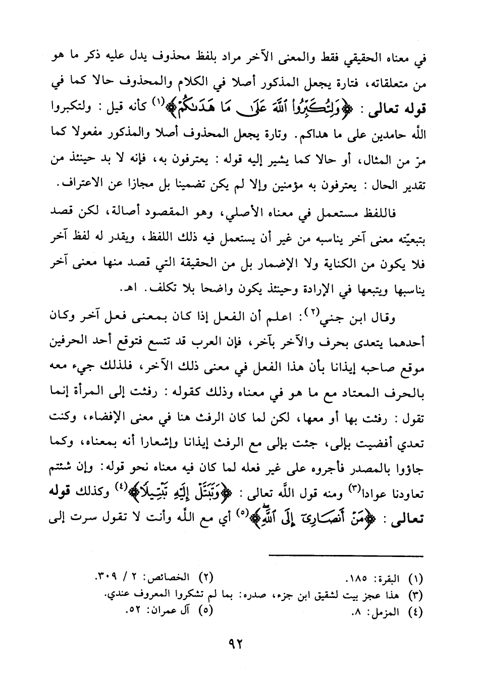 في معناه الحقيقي فقط والمعنى الآخر مراد بلفظ محذوف يدل عليه ذكر ما هو من متعلقاته، فتارة يجعل المذكور أصلا في الكلام والمحذوف حالا كما في قوله تعالى: (وَلِتُكَبِّرُوا اللَّهَ عَلَى مَا هَدَاكُمْ) كأنه قيل: ولتكبروا اللَّه حامدين على ما هداكم. وتارة يجعل المحذوف أصلا والمذكور مفعولا كما مر من المثال، أو حالا كما يشير إليه قوله: يعترفون به، فإنه لا بد حينئذٍ من تقدير الحال: يعترفون به مؤمنين وإلا لم يكن تضمينا بل مجازا عن الاعتراف.