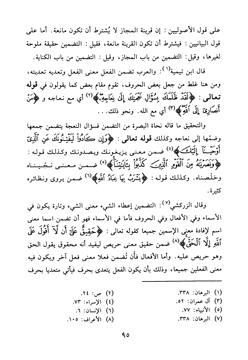 وقال الزركشي: التضمين إعطاء الشيء معنى الشيء وتارة يكون في الأسماء وفي الأفعال وفي الحروف فأما في الأسماء فهو أن تضمن اسما معنى اسم لإفادة معنى الاسمين جميعا كقوله تعالى: (حَقِيقٌ عَلَى أَنْ لَا أَقُولَ عَلَى اللَّهِ إِلَّا الْحَقَّ) ضمن حقيق معنى حريص ليفيد أنه محقوق يقول الحق وهو حريص عليه. وأما الأفعال فأن تُضمن فعلا معنى فعل آخر ويكون فيه معنى الفعلين جميعا، وذلك بأن يكون الفعل يتعدى بحرف فيأتي متعديا بحرف