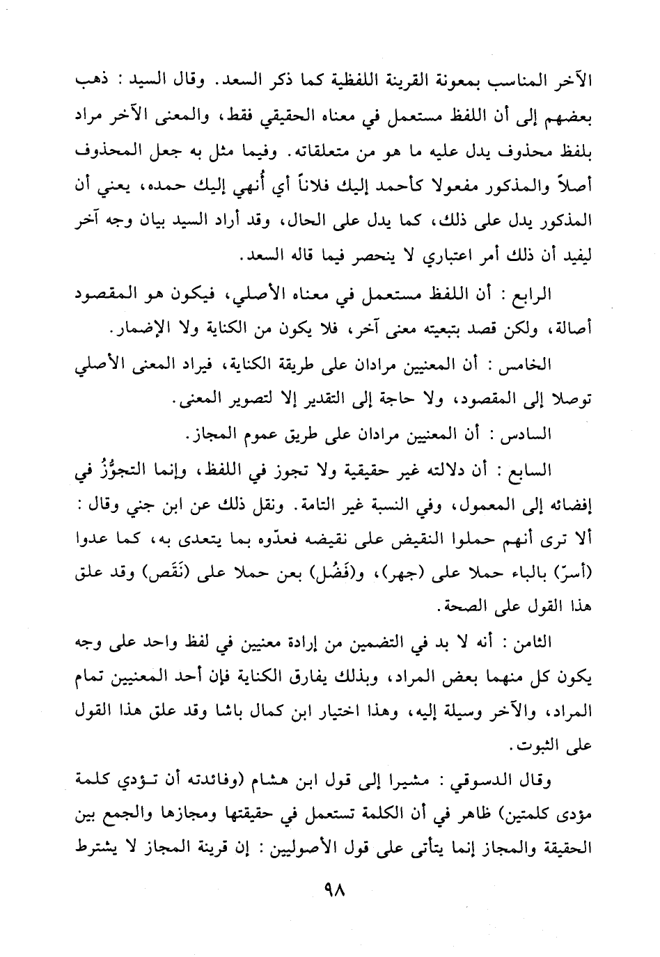 وقال الدسوقي: مشيرا إلى قول ابن هشام (وفائدته أن تؤدي كلمة مؤدى كلمتين) ظاهر في أن الكلمة تستعمل في حقيقتها ومجازها والجمع بين الحقيقة والمجاز إنما يتأتى على قول الأصوليين: إن قرينة المجاز لا يشترط