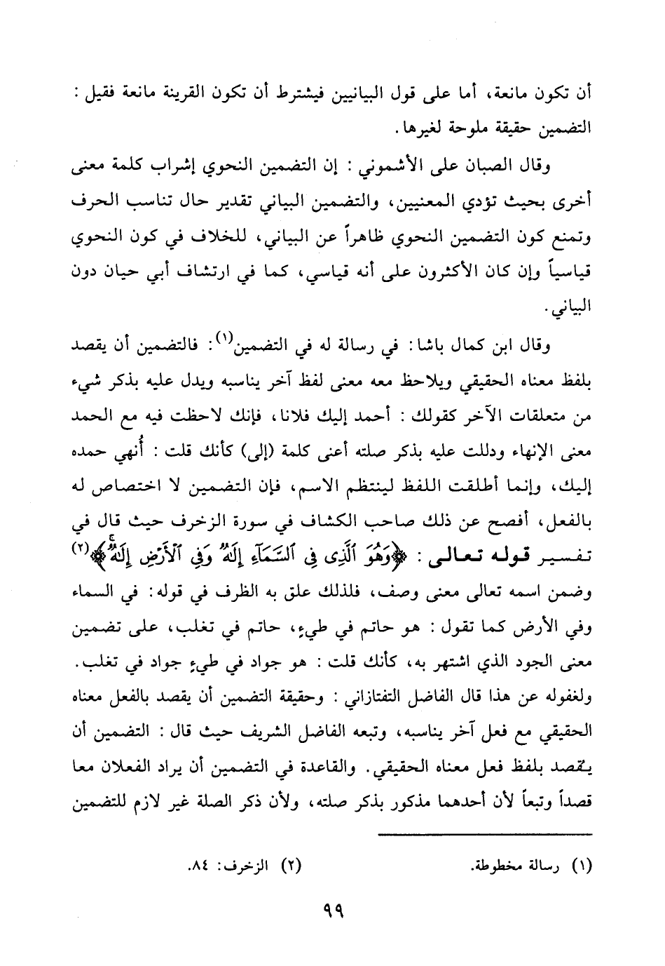 وقال ابن كمال باشا: في رسالة له في التضمين: فالتضمين أن يقصد بلفظ معناه الحقيقي ويلاحظ معه معنى لفظ آخر يناسبه ويدل عليه بذكر شيء من متعلقات الآخر كقولك: أحمد إليك فلانا، فإنك لاحظت فيه مع الحمد معنى الإنهاء ودللت عليه بذكر صلته أعنى كلمة (إلى) كأنك قلت: أُنهي حمده إليك، وإنما أطلقت اللفظ لينتظم الاسم، فإن التضمين لا اختصاص له بالفعل، أفصح عن ذلك صاحب الكشاف في سورة الزخرف حيث قال في تفسير قوله تعالى: (وَهُوَ الَّذِي فِي السَّمَاءِ إِلَهٌ وَفِي الْأَرْضِ إِلَهٌ) وضمن اسمه تعالى معنى وصف، فلذلك علق به الظرف في قوله: في السماء وفي الأرض كما تقول: هو حاتم في طيءٍ، حاتم في تغلب، على تضمين معنى الجود الذي اشتهر به، كأنَّك قلت: هو جواد في طيءٍ جواد في تغلب.