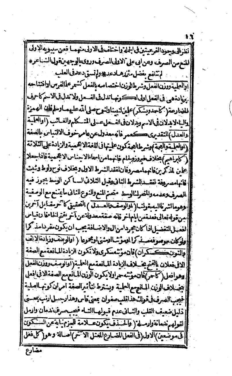 أو العلمية ووزن الفعل وشرط الوزن اختصاصه بالفعل كشمر علما لفرس أو افتتاحه بزيادة هي في الفعل أولى لكونها تدل في الفعل ولا تدل على الاسم كاحرف المضارعة (كأحمد ويشكر) علمين لنبينا ولنوح صلى الله عليهما وسلم فإن الهمزة والياء لا يدلان في الاسم ويدلان في الفعل على المتكلم والغائب (أو العلمية والعدل) التقديري كعمر فإنه معدول عن عامر خوف الالتباس بالصفة (أو العلمية والعجمة) وشرط العجمة كون علميتها في اللغة الأعجمية والزيادة على الثلاثة (كإبراهيم) بخلاف فيروز ولجام فإنهما مصروفان لفقد الشرط الأول وبخلاف نوح ولوط وشيث فإنها مصروفة لفقد الشرط الثاني وقيل الثلاثي الساكن الوسط يجوز فيه الصرف وعدمه والتحرك الوسط متحتم المنع والنوع الثاني ما يمتنع مع الوصفية وهو ما اشرنا إليه بقولنا (أو الوصف والعدل) التحقيقي (كآخر) مقابل آخرين من قوله تعالى فعدة من أيام أخر فإنه صفة معدولة عن آخر بفتح الخاء فإن قياس افعل التفضيل إذا كان مجردا من أل والأضافة يجب أن يكون مفردا مذكرا ولو كان موصوفه مذكرا أو مؤنثا أو مجموعا (أو الوصف وزيادة الألف والنون كسكران) فإن مؤنثة سكرى ولا تكون الزيادة المانعة مع الصفة إلا في فعلان بالفتح بخلاف الزيادة المانعة مع العلمية (أو الوصف ووزن الفعل) وهو أفعل (كأحمر) فإن مؤنثه حمرا ولا يكون الوزن المانع مع الصفة إلا في أفعل بخلاف الوزن المانع مع العملية ويشترط لتأثير الصفة أمران كونها أصلية فيجب الصرف في قولك هذا قلب صفوان بمعنى قاس وهذا رجل أرنب بمعنى ذليل ضعيف القلب والثاني عدم قبولها التاء فيجب صرف ندمان وارمل لقولهم ندمانة وارملة (والحذف يكون علامة للجزم نيابة عن السكون في موضعين) الأول (في الفعل المضارع المعتل الآخر) أصالة وهو (كل فعل