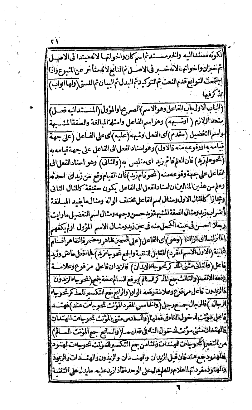 (باب الفاعل وهو الاسم) الصرح أو المؤول (المسند إليه فعل) متعد أو لازم (أو شبهه) وهو اسم الفاعل وأمثلة المبالغة والصفة المشبهة واسم التفضيل (مقدم) أي الفعل أو شبهه (عليه) أي على الفاعل (على جهة قيامه به أو وقوعه منه فالأول) وهو اسناد الفعل إلى الفاعل على جهة قيامه به (نحو علم زيد) فإن العلم قائم بزيد أي متلبس به (والثاني) وهو اسناد الفعل إلى الفاعل على جهة وقوعه منه (نحو قام زيد) فإن القيام وقع من زيد أي أحدثه وعلم من هذين المثالين أن إسناد الفعل إلى الفاعل يكون حقيقة كالمثال الثاني ومجازا كالمثال الأول ومثال اسم الفاعل يكون حقيقة كالمثال الثاني ومجازا كالمثال الأول ومثال اسم الفاعل مختلف ألوانه ومثال اسم الفاعل مختلف الوانه ومثال ما يفيد المبالغة أضراب زيد ومثال الصفة المشبهة زيد حسن وجهه ومثال الاسم المؤول أو لم يكفهم أنا انزلنا أي انزالنا (وهو) أي الفاعل (على قسمين ظاهر ومضمر) (فالظاهر أقسام) ثمانية (الأول الاسم المفرد) المقابل للتثنية والجمع نحو (جاء زيد) فجاء فعل ماض وزيد فاعل (والثاني مثنى المذكر نحو جاء الزيدان) فالزيدان فاعل مرفوع وعلامة رفعه الألف (والثالث جمع المذكر السالم) برفع السالم صفة لجمع (نحو جاء الزيدون) فالزيدون فاعل مرفوع وعلامة رفعه الواو (والرابع جمع التكسير للمذكر نحو جاء الرجال) فالرجال جمع رجل (والخامس المفرد المؤنث نحو جاءت هند) فهند فاعل مؤنث لدخول التاء في فعلها (والسادس مثنى المؤنث نحو جاءت الفاطمتان) فالهندان مثنى مؤنث لدخول التاء في فعلهما (والسابع جمع المؤنث السالم) من التغير (نحو جاءت الهندات والثامن جمع التكسير للمؤنث نحو جاءت الهنود) فالهنود ججمع هند فإن قيل الزيدات والهندان والزيدون والهندات والزيود والهنود مفرداتها أعلام والعلم يدل على الوحدة فإذا زيد عليه ما يدل على التثنية