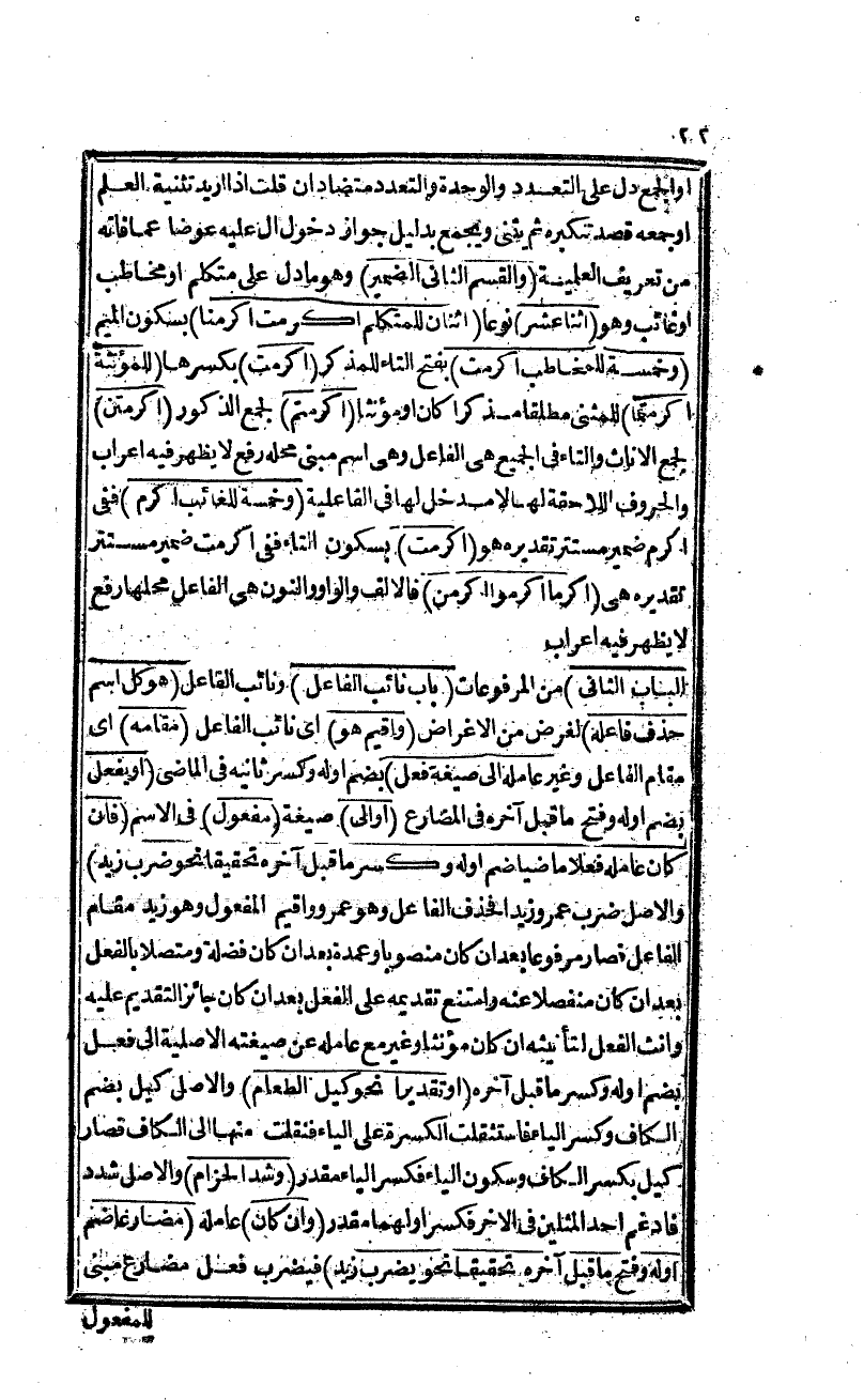 من المرفوعات باب (نائب الفاعل) ونائب الفاعل (هو كل اسم حذف فاعله) لغرض من الأغراض (وأقيم هو) أي نائب الفاعل (مقامه) أي مقام الفاعل (وغير عامله إلى صيغة فعل) بضم وله وكسر نانية في الماضي (أو بفعل) بضم أوله وفتح ما قبل آخره في المضارع (أو) صيغة (مفعول) في الاسم (فإن كان عامله فعلا ماضيا ضم أوله وكسر ما قبل آخره نحو ضرب زيد) والأصل ضرب عمر وزيدا فحذف الفاعل وهو عمرو وأقيم المفعول وهو زيد مقام الفاعل فصار مرفوعا بعد أن كان منصوبا وعمدة بعد أن كان فضلة ومتصلا بالفعل بعد أن كان منفصلا عنه وامتنع تقديمه على الفعل بعد أن كان جائزا لتقديم عليه وانث الفعل لتأنيثه أن كان مؤنثا وغيره مع عامله عن صيغته الأصلية إلى فعل بضم أوله وكسر ما قبل آخره (أو تقديرا نحو كيل الطعام) والأصل كيل بضم الكاف وكسر الياء فاستثقلت الكسرة على الياء فنقلت منها إلى الكاف فصار كيل بكسر الياء فاستثقلت الكسرة على الياء فنقلت منها إلى الكاف فصار كيل بكسر الكاف وسكون الياء فكسر الياء مقدر (وإن كان) عامله (مضارعا ضم أوله وفتح ما قبل آخره تحقيقا نحو يُضرب زيد) فيضرب فعل مضارع مبني