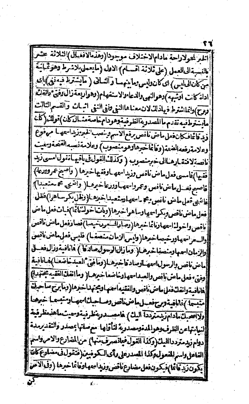 الخبر نحو لا راحة ما دام الاختلاف موجودا (وهذه الأفعال) الثلاثة عشر بالنسبة إلى العمل (على ثلاثة أقسام) الأول (ما يعمل بلا شرط وهو ثمانية من كان إلى ليس) أي كان وليس وما بينهما والثاني (وما يشترط فيه نفي) بأي أداة كانت (أو شبهه) وهو النهي والدعاء والاستفهام (وهو زال وفتئ وانفك وبرح) وإنما اشترط فيها ذلك لأن معناها النفي ونفي النفي اثبات والقسم الثالث (ما يشترط فيه تقدم ما المصدرية الظرفية وهو دام خاصة مثال كان قولك كان زيد قائما فكان فعل ماض ناقص يرفع الاسم وينصب الخبر زيد اسمها وهو مرفوع) وعلامة رفعه الضمة (وقائما خبرها وهو منصوب) وعلامة نصبه الفتحة وسميت ناقصة لافتقارها إلى خبر منصوب (وكذا القول في باقيها نقول أمسى زيد فقيها) فأمسى فعل ماض ناقص وزيد اسمها وفقيها خبرها (واصبح عمرو ورعًا) فاصبح فعل ماض ناقص وعمروا سمها وورعا خبرها (وأضحى محمد متعبدا) فاضحى فعل ماض ناقص ومحمد اسمها ومتعبدا خبرها (وظل بكر ساهرا) فظل فعل ماض ناقص وبكر اسمها وساهرا خبرها (وبات اخوك قائما) فبات فعل ماض ناقص وأخوك اسمها نائما خبرها (وصار السعر رخيصا) فصار فعل ماض ناقص والسعر اسمها ورخيصا خبرها (وليس الزمان منصفا) فليس فعل ماض ناقص والزمان اسمها ومنصفا خبرها (وما زال الرسول صادقا) فما نافية وزال فعل ماض ناقص والرسول اسمها وصادقا خبرها (وما فتى العبد خاضعا) فما نافية وفتى فعل ماض ناقص والعبد اسمها وخاضعا خبرها (وما انفك الفقيه مجتهدا) فما نافية وانفك فعل ماض ناقص والعبد اسمها وخاضعا خبرها (وما برح صاحبك متبسما) فما نافية وبرح فعل ماض ناقص وصاحبك اسمها ومتبسما خبرها (ولا أصحبك ما دام زيد مترددا إليك) فما مصدرية ظرفية وسميت ما هذه ظرفية لنيابتها عن الظرف وهو المدة ومصدرية لتأولها مع صلتها بمصدر والتقدير مدة دوام زيد مترددا إليك (وكذا القول فيما تصرف منها) من المضارع والأمر واسم الفاعل واسم المفعول وكذا المصدر على رأى الكوفيين (فتقول في مضارع كان يكون زيد قائمًا) فيكون فعل مضارع ناقص وزيد اسمها وقائما خبرها (وفي الأمر
