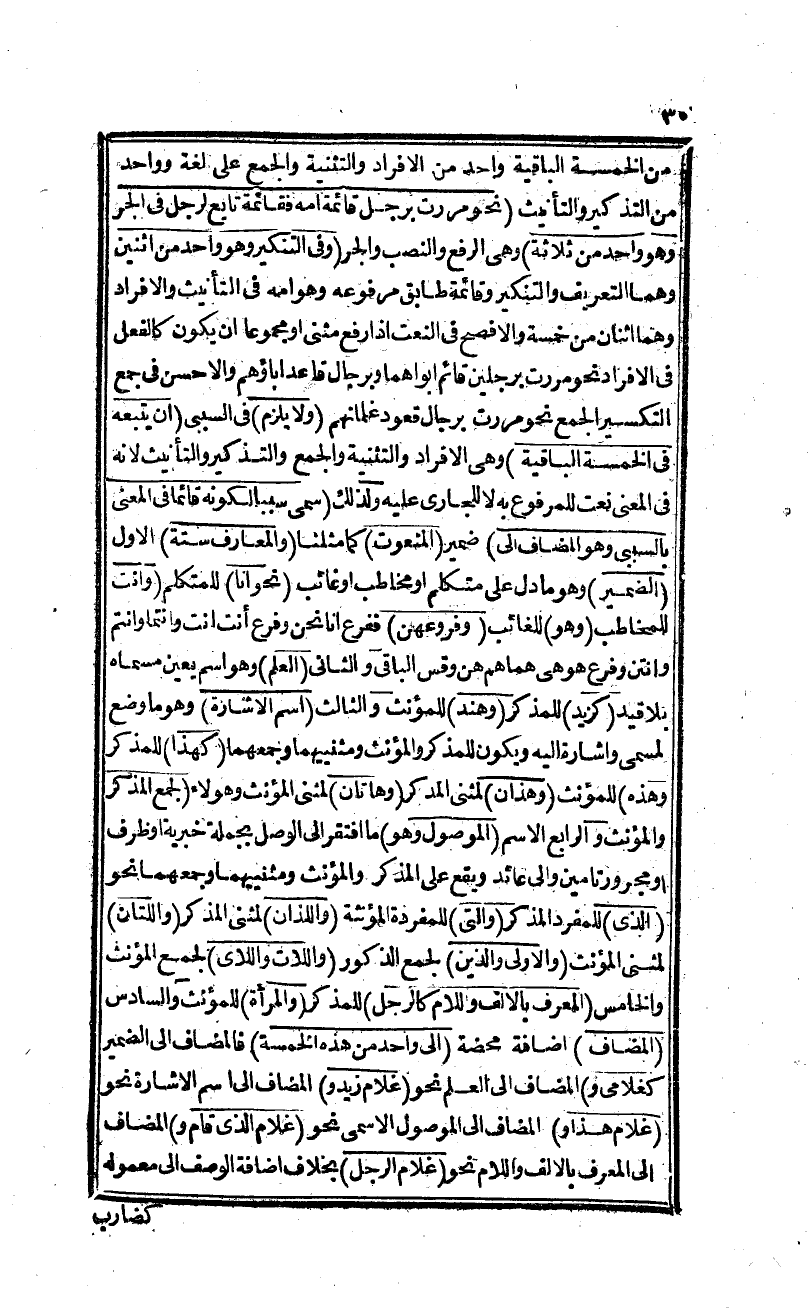 من الخمسة الباقية واحد من الأفراد والتثنية والجمع على لغة وواحد من التذكير والتأنيث (نحو مررت برجل قائمة أمة فقائمة تابع لرجل في الجر وهو واحد من ثلاثة) وهي الرفع والنصب والجر (وفي التنكير وهو واحد من اثنين) وهما التعريف والتنكير وقائمة طابق مرفوعه وهو أمه في التأنيث والأفراد وهما اثنان من خمسة والأفصح في النعت إذا رفع مثنى أو مجموعا أن يكون كالفعل في الأفراد نحو مررت برجلين قائم أبواهما وبرجال قاعد أباؤهم والأحسن في جمع التكسير الجمع نحو مررت برجال قعود غلمانهم (ولا يلزم في السببي أن يتبعه في الخمسة الباقية) وهي الأفراد والتثنية والجمع والتذكير والتأنيث) لأنه في المعنى نعت للمرفوع به لا للجاري عليه وكذلك (وسمي سببا لكونه قائما في المعنى بالسببي وهو المضاف إلى ضمير المنعوت) كما مثلنا (والمعارف ستة) الأول (المضمر) وهو ما دل على متكلم أو مخاطب أو غائب (نحو أنا) للمتكلم (وأنت) للمخاطب (وهو) للغائب (وفروعهن) ففرع أنا نحن وفرع أنت أنت وأنتما وانتم وانتن وفرع هو هي هماهم هن وقس الباقي والثاني (والعلم) وهو اسم يعين مسماه بلا قيد (كزيد) للمذكر (وهند) للمؤنث والثالث (اسم الإشارة) وهو ما وضع لمسمى وإشارة إليه ويكون للمذكر والمؤنث ومثنييهما وجمعهما نحو (الذي) للمفرد المذكر (والتي) للمفردة المؤنثة (واللذان) لمثنى المذكر (واللتان) لمثنى المؤنث والأولى (والذين) لجمع الذكور (واللات واللاي) لجمع المؤنث والخامس (المعرف بالألف واللام كالرجل) للمذكر (والمرأة) للمؤنث والسادس (والمضاف) اضافة محضة (إلى واحد من هذه الخمسة) فالمضاف إلى الضمير (كغلامي و) المضاف إلى العلم نحو (وغلام زيد و) المضاف إلى اسم الأشارة نحو (غلام هذا و) المضاف إلى الموصول الأسمي نحو (غلام الذي قام و) المضاف إلى المعرف بالألف واللام نحو (غلام الرجل) بخلاف اضافة الوصف إلى معموله