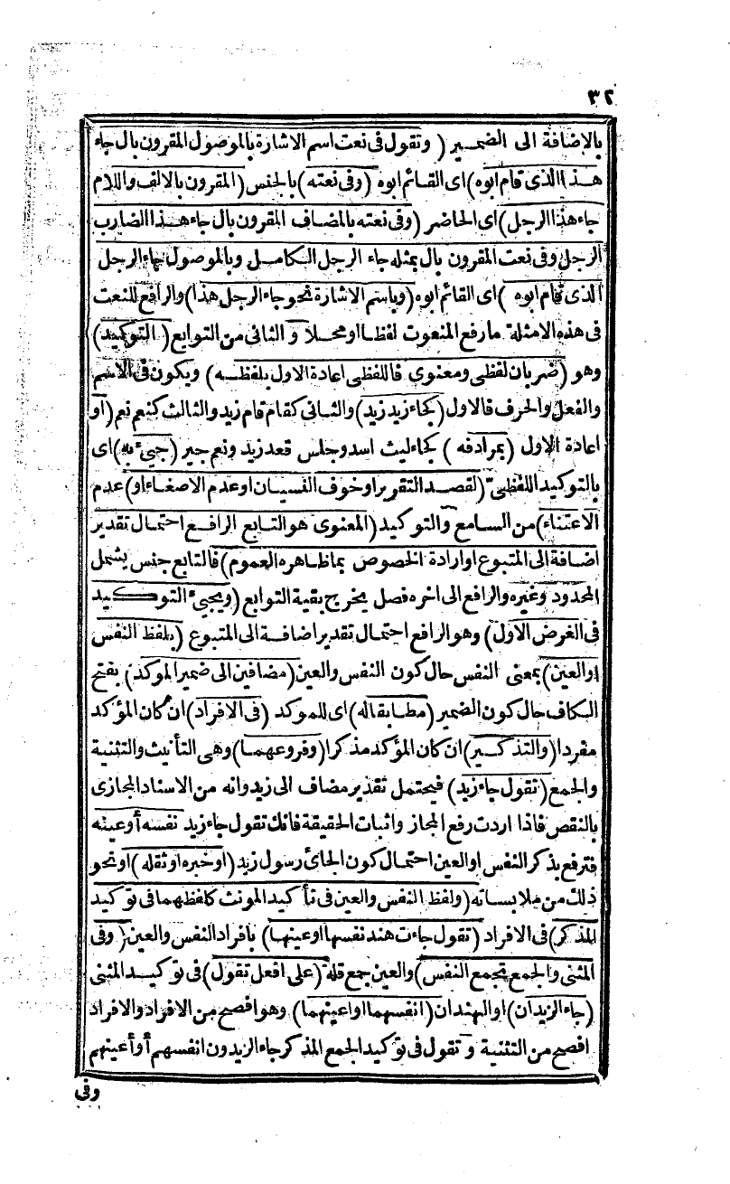 بالإضافة إلى الضمير (وتقول في نعت اسم الإشارة بالموصول) المقرون بال (جاء هذا الذي قام أبوه) أي القائم أبوه (وفي نعته) بالجنس (بالمقرون بالألف واللام جاء هذا العالم) أي الحاضر (وفي نعته بالمضاف المقرون بال جاء هذا الضارب الرجل وفي نعت المقرون بمثله جاء الرجل الكامل وبالموصول جاء الرجل الذي قام أبوه) أي القائم أبوه (وباسم الإشارة نحو جاء الرجل هذا) والرافع للنعت في هذه الأمثلة ما رفع المنعوت لفظًا أو محلًا والثاني من التوابع (التوكيد وهو) ضربان (لفظي ومعنوي فاللفظي إعادة الأول بلفظه) ويكون في الاسم والفعل والحرف فالأول (كجاء زيد زيد) والثاني كقام قام زيد والثالث كنعم نعم (أو) إعادة الأول (بمرادفه كجاء ليث أسد) وجلس قعد زيد ونعم جير (وإنما جيء به) أي بالتوكيد اللفظيّ (لقصد التقرير أو خوف النسيان أو عدم الإصغاء أو الاعتداد) عدم الاعتناء من السامع والتوكيد (المعنوي هو التابع الرافع احتمال تقدير إضافة إلى المتبوع أو إرادة الخصوص بما ظاهره العموم) فالتابع جنس يشمل المحدود وغيره والرافع إلى أخره فصل يخرج بقية التوابع (ويجيء) التوكيد (في الغرض الأول) وهو الرافع احتمال تقدير إضافة إلى المتبوع (بلفظ النفس أو العين) بمعنى النفس حال كون النفس والعين (مضافين إلى ضمير المؤكد) بفتح الكاف حال كون الضمير (مطابقا له) أي للموكد (في الأفراد) أن كان المؤكد مفردا (والتذكير) أن كان المؤكد مذكرا (وفروعهما) وهي التأنيث والتثنية والجمع نقول جاء زيد فيحتمل تقدير مضاف إلى زيد وأنه من الإسناد المجازي بالنقص فإذا اردت رفع المجاز واثبات الحقيقة فإنك تقول (نحو جاء زيد نفسه أو عينه فترفع بذكر النفس أو العين احتمال كون الجائي رسول زيد أو خبره أو نحو ذلك) من ملابساته (ولفظ النفس والعين في توكيد المؤنث كلفظهما في توكيد المذكر) في الأفراد (تقول جاءت هند نفسها أو عينها) بإفراد النفس والعين (وفي المثنى والجمع تجمع النفس والعين) جمع قلة (على أفعل تقول) في توكيد المثنى (جاء الزيدان) أو الهندان (أنفسهما أو أعينهما) وهو أفصح من الأفراد والأفراد أفصح من التثنية وتقول في توكيد الجمع المذكر (وجاء الزيدون أنفسهم أو أعينهم)