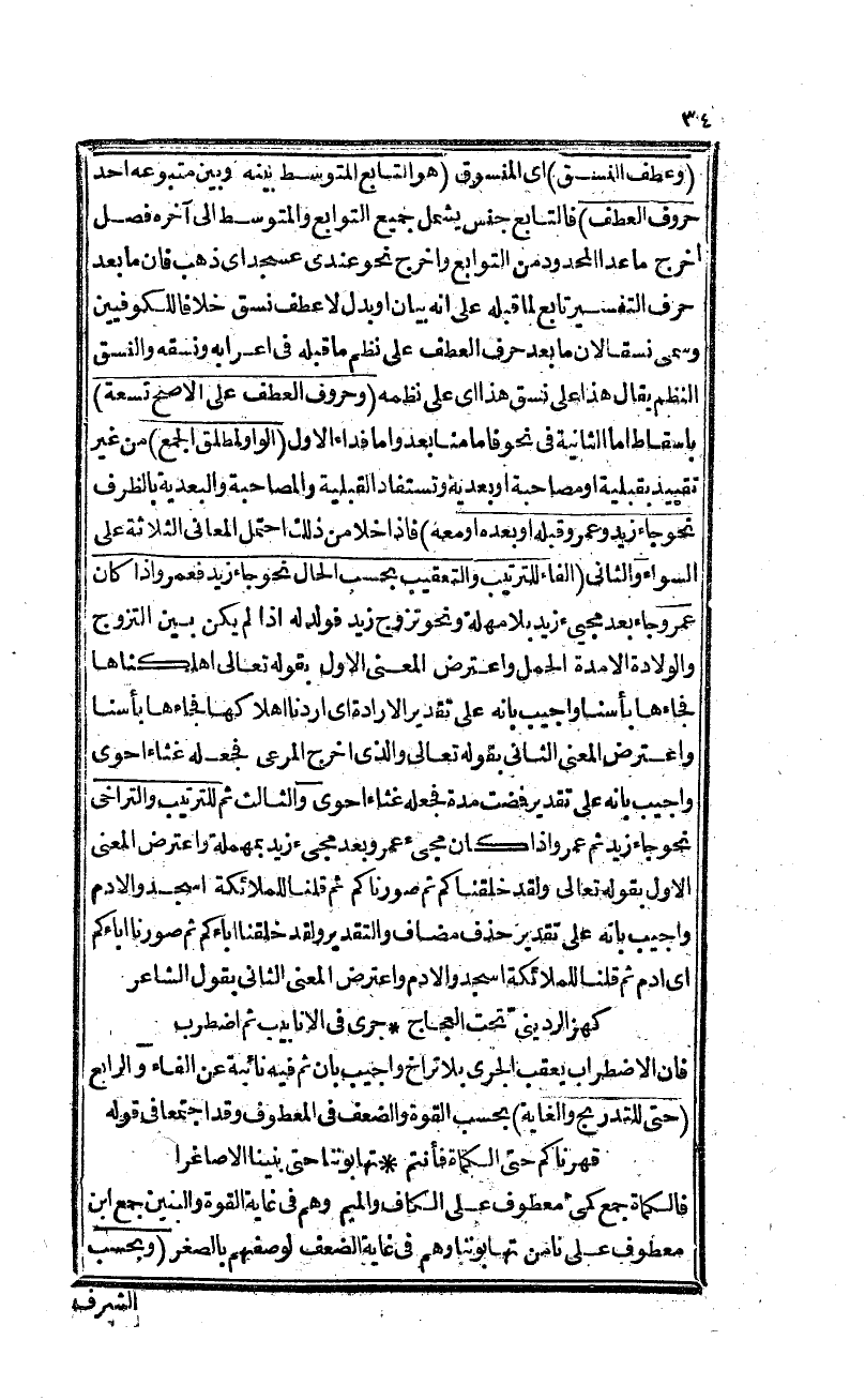 (وعطف النسق) أي المنسوق (وهو التابع المتوسط بينه وبين متبوعه أحد حروف العطف) فالتابع جنس يشمل جميع التوابع والمتوسط إلى آخره فصل أخرج ما عدا المحدود من التوابع واخرج نحو عندي مسجد أي ذهب فإن ما بعد حرف التفسير تابع لما قبله على أنه بيان أو بدل لا عطف نسق خلافا للكوفيين وسمى نسقا لأن ما بعد حرف العطف على نظم ما قبله في إعرابه ونسقه والنسق النظم يقال هذا على نسق هذا أي على نظمه (وحروف العطف على الأصح تسعة) بإسقاط أما الثانية في نحو فأما منا بعد وأما فداء الأول (الواو المطلق الجمع) من غير تقييد بقبلية أو مصاحبة أو بعدية وتستفاد القبلية والمصاحبة والبعدية بالظرف (نحو جاء زيد وعمرو قبله أو معه أو بعده) فإذا خلا من ذلك احتمل المعاني الثلاثة على السواء والثاني (والفاء للترتيب) والتعقيب (بحسب الحال نحو جاء زيد فعمر) وإذا كان عمر وجاء بعد مجيء زيد بلا مهلة ونحو (وتزوج زيد فولد له) إذا لم يكن بين التزوج والولادة الأمدة الحمل واعترض المعنى الأول بقوله تعالى: {أهلكناها فجاءها بأسنا} واجيب بأنه على تقدير الإرادة أي اردنا اهلاكها فجاءها بأسنا واعترض المعنى الثاني بقوله تعالى: {والذي أخرج المرعى فجعله غثاء أحوى} وأجيب بأنه على تقدير فضت مدة فجعله غثاء أحوى والثالث (وثم الترتيب والتراخي نحو جاء زيد ثم عمر) وإذا كان مجيء عمر وبعد مجيء زيد بمهملة واعترض المعنى الأول بقوله تعالى ولقد خلقناكم ثم صورناكم ثم قلنا للملائكة اسجدوا لآدم واجيب بأنه على تقدير حذف مضاف والتقدير ولقد خلقنا اباءكم ثم صورنا اباءكم أي آدم ثم قلنا للملائكة اسجدوا لآدم واعترض المعنى الثاني بقول الشاعر: